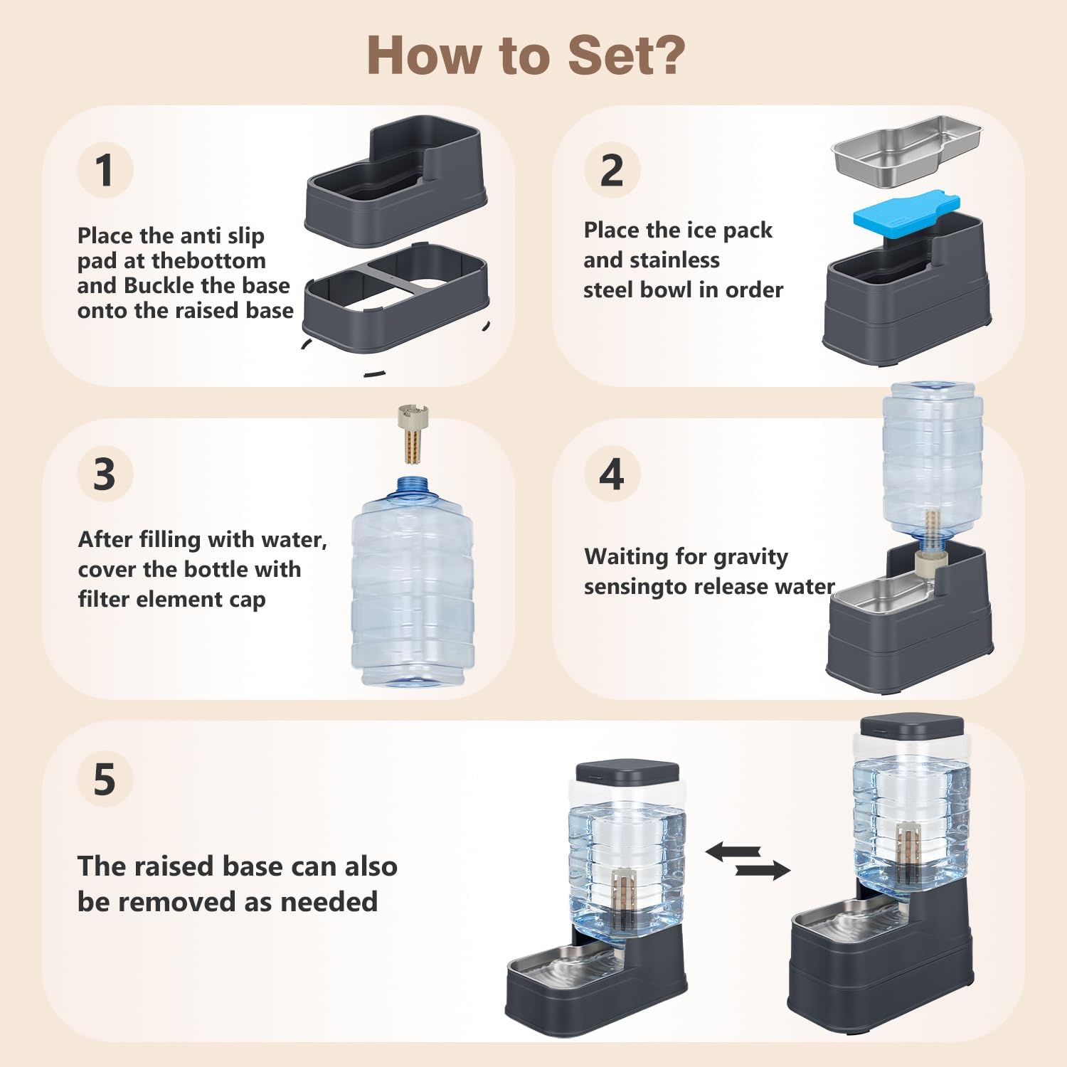 <br> Product Dimensions : 5 x 5 x 5 inches; 3.42 Pounds <br> Item model number : HB-HL004 <br> Date First Available : October 30, 2025 <br> Manufacturer : HWONMTE <br> ASIN : B0FYCKVR2C <br> Best Sellers Rank: #23,928 in Pet Supplies (See Top 100 in Pet Supplies) #63 in Dog Automatic Feeders <br> Customer Reviews: 4.3 4.3 out of 5 stars (123) var dpAcrHasRegisteredArcLinkClickAction; P.when('A', 'ready').execute(function(A) { if (dpAcrHasRegisteredArcLinkClickAction !== true) { dpAcrHasRegisteredArcLinkClickAction = true; A.declarative( 'acrLink-click-metrics', 'click', { "allowLinkDefault": true }, function (event) { if (window.ue) { ue.count("acrLinkClickCount", (ue.count("acrLinkClickCount") || 0) + 1); } } ); } }); P.when('A', 'cf').execute(function(A) { A.declarative('acrStarsLink-click-metrics', 'click', { "allowLinkDefault" : true }, function(event){ if(window.ue) { ue.count("acrStarsLinkWithPopoverClickCount", (ue.count("acrStarsLinkWithPopoverClickCount") || 0) + 1); } }); }); <br>Upgrading Water Stainless Steel Bowl: Automatic pet water dispenser made of safe, natural material. The bottom of the automatic cat feeder has been upgraded with a movable stainless steel bowl to keep food fresher and easy to clean, not easily deformed, not rusty,sturdy and sanitary<br>Large Capacity of Dog Water Bowl:the 8L automatic pet feeder water bowl can hold about 2.2 gallon water,can be used by small medium pets about 16-25 days, 8-15 days for large pets<br>Adjustable Heights: This Automatic dog feeder design with adjustable raised base with from 3.15 to 6.3 inches,eliminating the need to have them stoop over to eat helps reduce strain on their neck and back<br>Cat Feeder Equipped with Replaceable Filter:This dog water bowl built-in natural stones 's filter and reusable ice pack which helps keeping water clear and fresh(The ice pack can be removed when not in use,which needs to be frozen in the refrigerator before use, and the duration of cold retention is related to the air temperature)<br>Gravity Water Feeding Dispenser:This auto water dispenser combo uses the power of gravity to slowly refills water to bottle by gravity.You can rest assured to go to vacation, work, party, don't worry that pets will be thirsty<br>Easy to Clean: The split design makes it very convenient to disassemble the various components of this automatic water dispenser.We recommend hand wash. If you want to use dishwasher, please turn off the heating function to avoid high-temperature