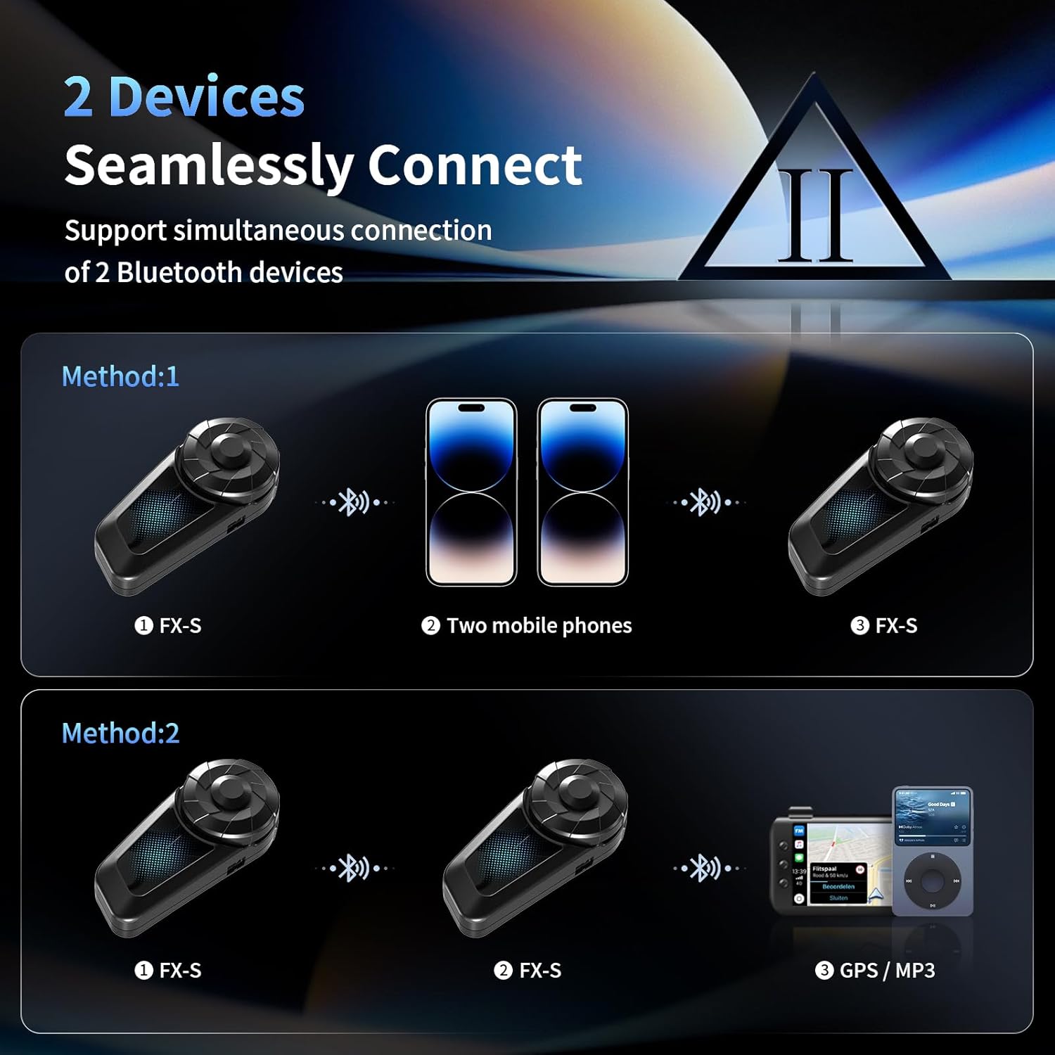 Smart Noise Reduction, 2 Phones Connected: FX-S motorcycle communication system utilizes CVC & DSP noise cancellation to effectively eliminate the effects of all types of noise and maintain the purest and clearest vocals. Supporting 2 phones connected, you can easily switch between them without frequently pairing