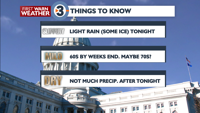 PLANNING THE NEXT 24 HOURS: Light rain is expected overnight, with some freezing rain mixing in at times. Other than lingering rain early Thursday morning, most of the day Thursday will be dry with highs warming up to around 50° under partly to mostly cloudy skies.