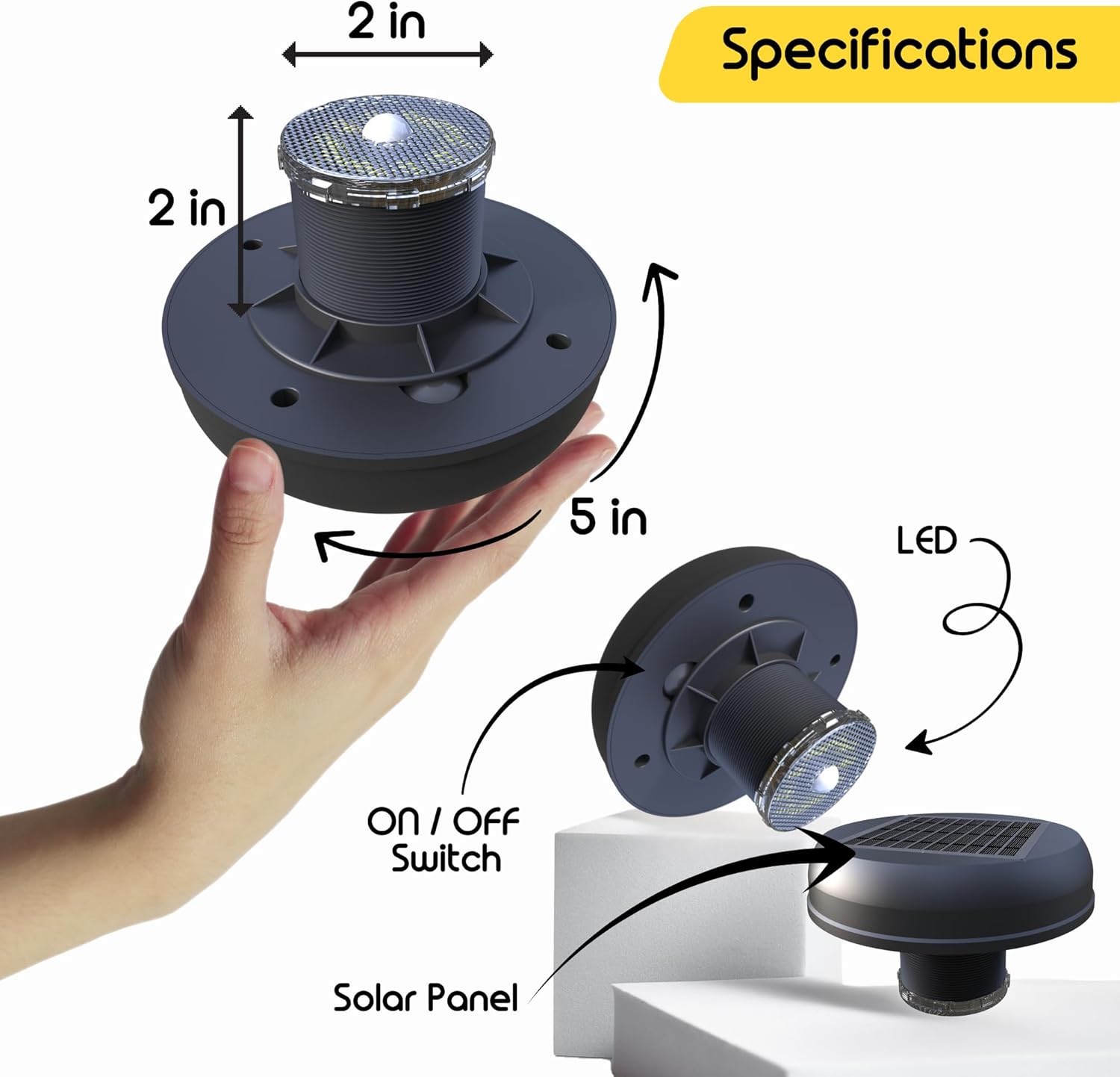 <br>Portable Potty: Convenient and compact portable toilet for camping and outdoor use<br>Daylight Illumination: Color temperature of 5000K provides clear and bright lighting for optimal visibility.<br>Durable and Weatherproof: IP55 rating ensures protection against dust and water splashes, suitable for outdoor use.<br>Energy-Efficient and Long-Lasting: Solar-powered with a low input voltage of DC 3V, it operates with high lamp luminous efficiency (120 lm/w) and has a lifespan of 50,000 hours.<br>Motion Sensor Activation: Works for 45 seconds upon detecting motion, providing convenience and energy savings.