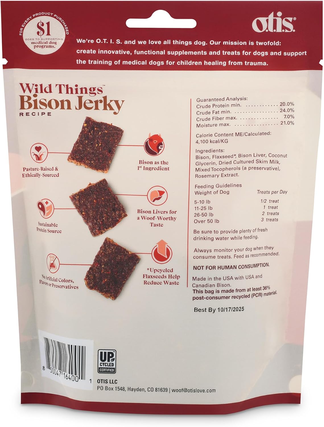 <br> Package Dimensions : 7.83 x 6.02 x 1.46 inches; 4.16 ounces <br> Date First Available : January 30, 2023 <br> Manufacturer : pet-jerky-treats <br> ASIN : B0BTGM1GFQ <br> Best Sellers Rank: #85,984 in Pet Supplies (See Top 100 in Pet Supplies) #575 in Dog Jerky Treats <br> Customer Reviews: 4.2 4.2 out of 5 stars (151) var dpAcrHasRegisteredArcLinkClickAction; P.when('A', 'ready').execute(function(A) { if (dpAcrHasRegisteredArcLinkClickAction !== true) { dpAcrHasRegisteredArcLinkClickAction = true; A.declarative( 'acrLink-click-metrics', 'click', { "allowLinkDefault": true }, function (event) { if (window.ue) { ue.count("acrLinkClickCount", (ue.count("acrLinkClickCount") || 0) + 1); } } ); } }); P.when('A', 'cf').execute(function(A) { A.declarative('acrStarsLink-click-metrics', 'click', { "allowLinkDefault" : true }, function(event){ if(window.ue) { ue.count("acrStarsLinkWithPopoverClickCount", (ue.count("acrStarsLinkWithPopoverClickCount") || 0) + 1); } }); }); <br>Animal Protein as First Ingredient: Made with pasture-raised bison as the first ingredient—protein-rich, flavorful, and perfect for dogs of all sizes.<br>Free from Unwanted Additives: No hormones, antibiotics, or artificial preservatives, colors, or flavors—just clean ingredients dogs enjoy.<br>Soft & Chewy Texture: Tender jerky is easy to chew and break—ideal for training, daily rewarding, or sharing a treat your dog will look forward to.<br>Functional Ingredients Inside: Upcycled flaxseed supports digestion, skin, and coat while helping reduce food waste with every bite.<br>Purpose-Driven Product: Each bag supports medical dog programs—give your dog a meaningful treat that contributes to something bigger.