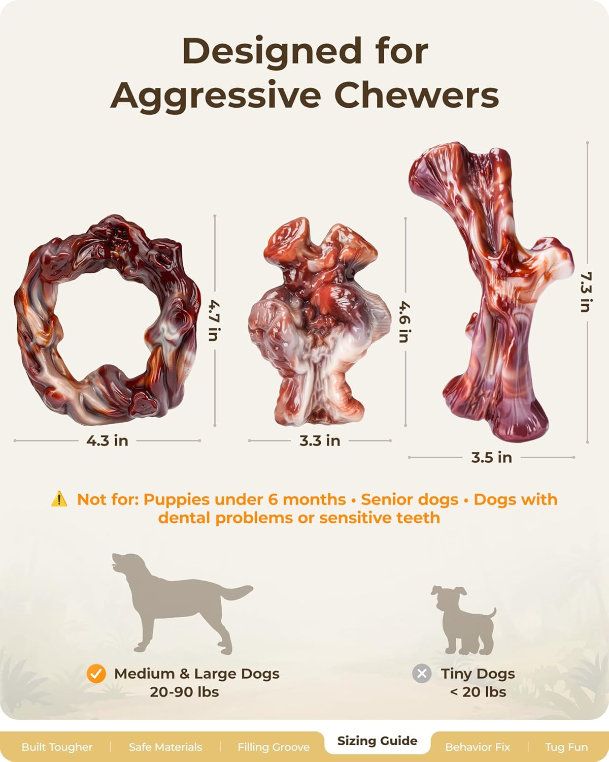 <br> Product Dimensions : 8 x 6 x 2.5 inches; 1.28 Pounds <br> Item model number : dog toys for aggressive chewers <br> Date First Available : November 2, 2025 <br> Manufacturer : ChienBox <br> ASIN : B0FPX22JK4 <br> Best Sellers Rank: #39,810 in Pet Supplies (See Top 100 in Pet Supplies) #641 in Dog Chew Toys <br> Customer Reviews: 4.7 4.7 out of 5 stars (43) var dpAcrHasRegisteredArcLinkClickAction; P.when('A', 'ready').execute(function(A) { if (dpAcrHasRegisteredArcLinkClickAction !== true) { dpAcrHasRegisteredArcLinkClickAction = true; A.declarative( 'acrLink-click-metrics', 'click', { "allowLinkDefault": true }, function (event) { if (window.ue) { ue.count("acrLinkClickCount", (ue.count("acrLinkClickCount") || 0) + 1); } } ); } }); P.when('A', 'cf').execute(function(A) { A.declarative('acrStarsLink-click-metrics', 'click', { "allowLinkDefault" : true }, function(event){ if(window.ue) { ue.count("acrStarsLinkWithPopoverClickCount", (ue.count("acrStarsLinkWithPopoverClickCount") || 0) + 1); } }); }); <br>Almost Indestructible – Survives Power Chewers: Imagine your 80-pound German Shepherd tearing into real bones in minutes — now picture him gnawing on these dog chew toys for aggressive chewers for weeks without a single big chunk breaking off. Built from ultra-tough nylon, it's proven tougher than real bones, plush toys, or antlers for aggressive chewers<br>Irresistible Real Bacon Flavor: The moment you open the box, a subtle smoky bacon scent wafts out — not overpowering for you, but your Lab picks it up instantly from across the room, drops his ball, dashes over with tail wagging wildly, and starts chewing like it's the ultimate reward he's been waiting for — these tough dog toys for aggressive chewers keep him hooked for hours<br>3 Realistic Branch Shapes for Variety: From the twisted Branch Ring your Pit Bull loves to flip and catch, to the chunky Branch Stump your Golden Retriever uses as a pillow after play — these aggressive chew toys for large dogs bring new excitement every day with their varied shapes and textures<br>Built-in Teeth Cleaning Texture: As your energetic Border Collie chomps away during zoomies cooldown, these chew toys for aggressive chewers with rugged textures gently scrub plaque and tartar off his teeth — healthier gums without any brushing fights<br>Stuffable Pockets for Puzzle Fun: Smear peanut butter, cheese, or treats into the pockets, watch your clever Aussie freeze, sniff, then go full detective mode licking and chewing for 30+ minutes of calm, focused fun — these durable dog toys for aggressive chewers turn every stuffing session into rewarding, long-lasting entertainment<br>Ergonomic Curved Design – Easy to Hold: Your playful Husky grabs the curved Branch Stitch in his mouth like a perfect handle, trots around the yard showing it off, or lies down comfortably gnawing without jaw strain — these super chewer dog toys make every play session effortless and enjoyable<br>100% Safe, Non-Toxic Material: Even if your super chewer eventually wears down tiny bits after months of use, they pass safely through his system — peace of mind while he enjoys endless chewing sessions with this dog chew toy<br>Perfect for 20-90 lbs Medium to Large Power Chewers: Tested on 80-pound Malinois and Pit mixes — they destroy plush toys in seconds but spend happy hours with these indestructible dog toys, finally giving you a break from constant toy replacement<br>Quick & Easy to Clean: After a fun, muddy romp in the park, simply rinse these tough chew toys for dogs under running water, give them a quick wipe with mild soap if needed, or pop them straight into the dishwasher — in seconds (or a short cycle), they're fresh and ready for your dog's next chewing session without any hassle<br>Elegant Gift Box – Ready to Impress: Surprise your friend’s new rescue dog at the birthday party — the stylish box opens to reveal three premium aggressive dog chew toys; both owner and pup light up with joy instantly