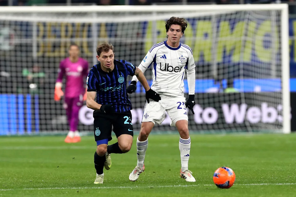 MILAN, ITALY – DECEMBER 06: Nicolo Barella of FC Internazionale Milano battles for possession with Maximo Perrone of Como 1907 during the Serie A match between FC Internazionale and Como 1907 at Giuseppe Meazza Stadium on December 06, 2025 in Milan, Italy. (Photo by Marco Luzzani/Getty Images)