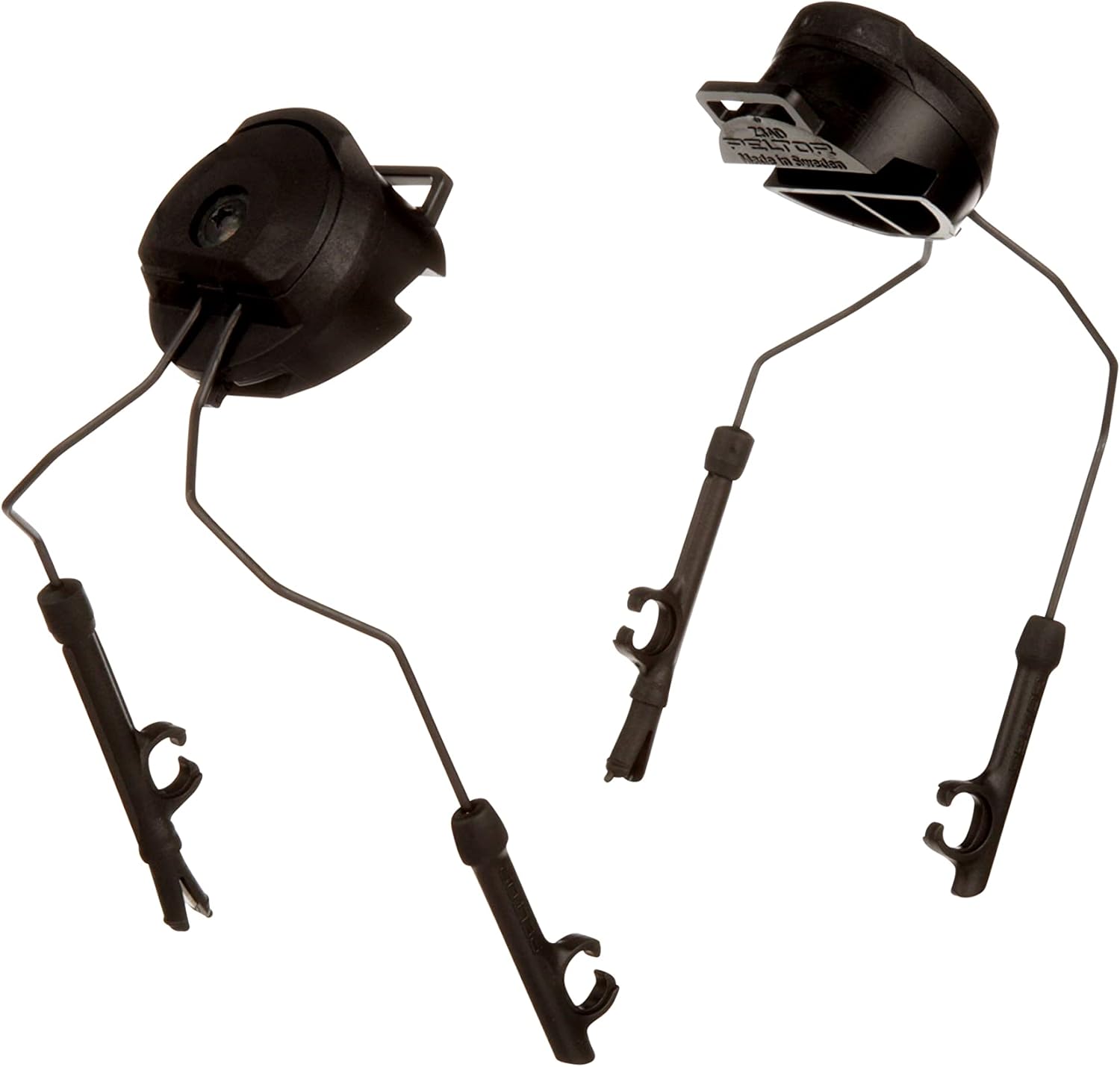 RAIL SYSTEM ATTACHMENT: Left and right guide arm attachments for mounting the headset onto a helmet rail system