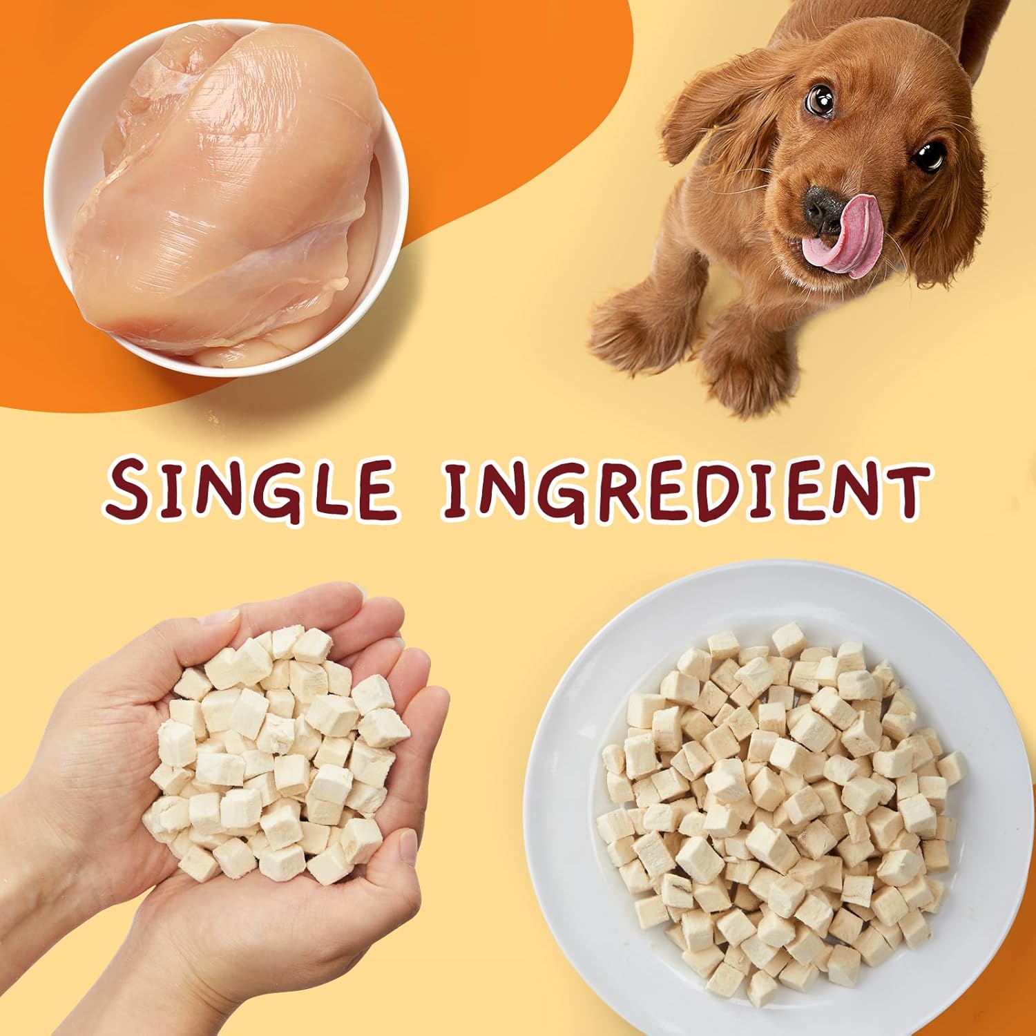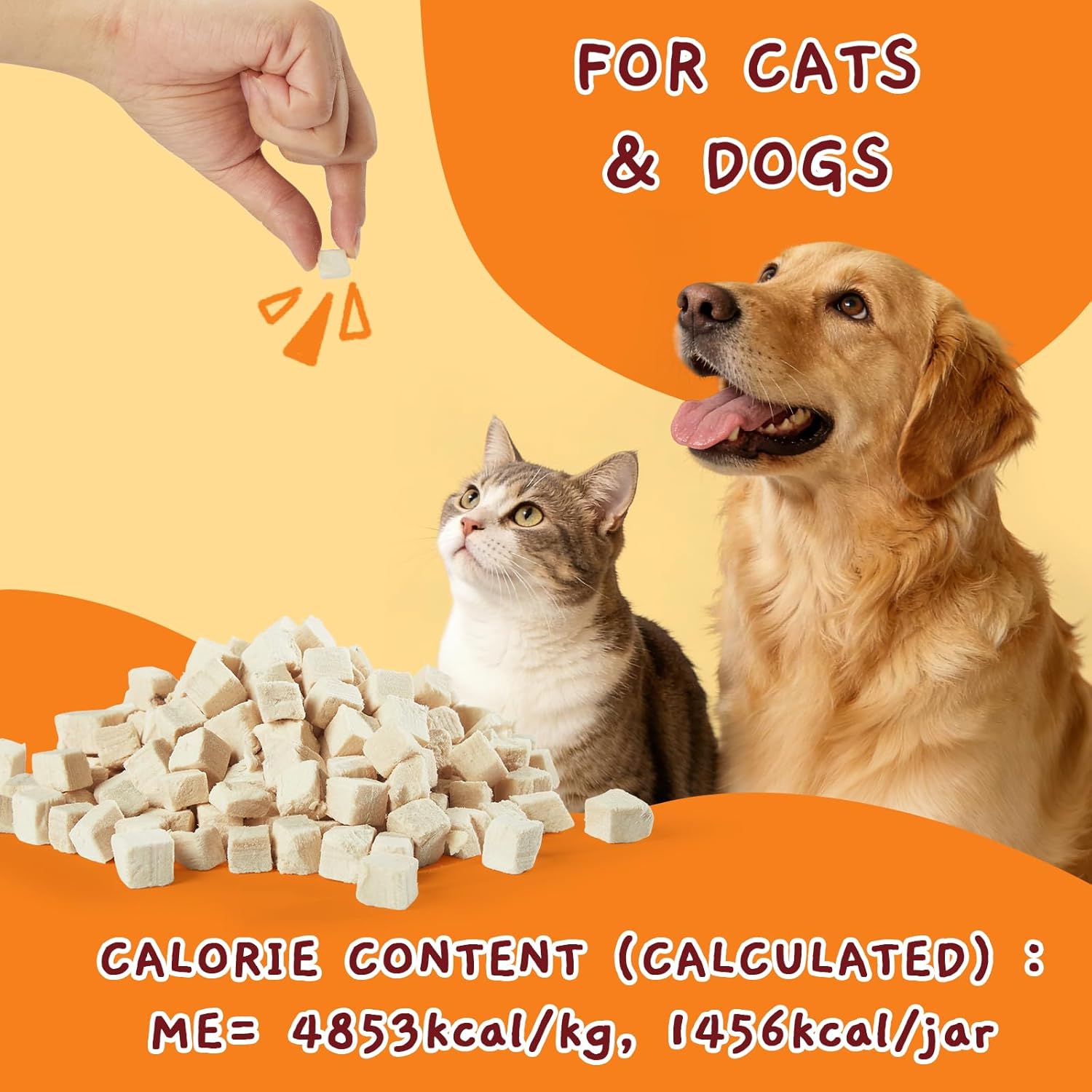 <br> Package Dimensions : 7.91 x 4.06 x 3.9 inches; 14.39 ounces <br> Date First Available : March 7, 2024 <br> Manufacturer : Trust Foodstuff <br> ASIN : B0CXDRVC4K <br> Best Sellers Rank: #4,280 in Pet Supplies (See Top 100 in Pet Supplies) #12 in Freeze-Dried Cat Food #2,782 in Dog Supplies <br> Customer Reviews: 4.4 4.4 out of 5 stars (367) var dpAcrHasRegisteredArcLinkClickAction; P.when('A', 'ready').execute(function(A) { if (dpAcrHasRegisteredArcLinkClickAction !== true) { dpAcrHasRegisteredArcLinkClickAction = true; A.declarative( 'acrLink-click-metrics', 'click', { "allowLinkDefault": true }, function (event) { if (window.ue) { ue.count("acrLinkClickCount", (ue.count("acrLinkClickCount") || 0) + 1); } } ); } }); P.when('A', 'cf').execute(function(A) { A.declarative('acrStarsLink-click-metrics', 'click', { "allowLinkDefault" : true }, function(event){ if(window.ue) { ue.count("acrStarsLinkWithPopoverClickCount", (ue.count("acrStarsLinkWithPopoverClickCount") || 0) + 1); } }); }); <br>PREMIUM QUALITY FREEZE DRIED CHICKEN: Selected high quality chicken is vacuum freeze-dried at ultra-low temperature to maintain the nutrition and taste<br>GRAIN-FREE & ADDITIVE-FREE: We insist on simple, clean, wholesome snacks for pets, freeze dried chicken cat and dog treats contain no grains, gluten or additives<br>80% HIGH PROTEIN FOR OPTIMAL DIGESTION: With a protein content of over 80%, freeze dried chicken cubes for cats and dogs are easy to digest and absorb, making them a good choice for pets with sensitive stomachs<br>MULTIPLE FEEDING METHODS: Pet owners are encouraged to innovate multiple feeding methods for freeze dried chicken cat and dog treats, for example, feeding directly as an interactive reward during pet training, mixing with pet food to appetize pets when they loss their appetite, and dipping in drinking water to guide pets to drink more water<br>CONVENIENT & PORTABLE: Packaged in large-capacity jars, freeze dried cat and dog treats are easy to feed and store. The jars can also be recycled for storage<br>CALORIE CONTENT (calculated): Metabolizable Energy (ME) 4853kcal/kg, 1456kcal/jar