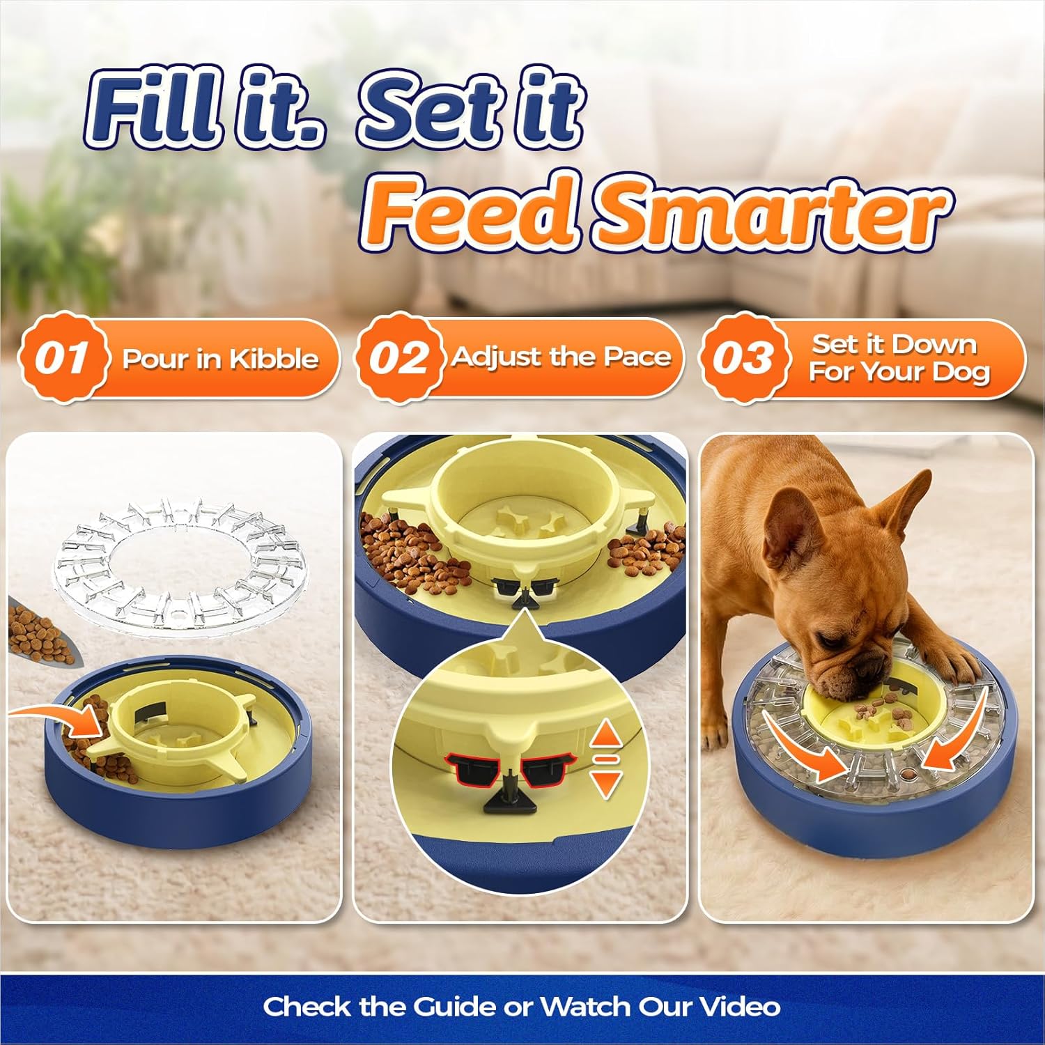<br> Product Dimensions : 11.97 x 3.15 x 11.97 inches; 2.03 Pounds <br> Item model number : KADTCMSGW <br> Date First Available : February 14, 2025 <br> Manufacturer : KADTC <br> ASIN : B0DX62S2SM <br> Best Sellers Rank: #9,147 in Pet Supplies (See Top 100 in Pet Supplies) #55 in Dog Slow Feeders <br> Customer Reviews: 4.3 4.3 out of 5 stars (240) var dpAcrHasRegisteredArcLinkClickAction; P.when('A', 'ready').execute(function(A) { if (dpAcrHasRegisteredArcLinkClickAction !== true) { dpAcrHasRegisteredArcLinkClickAction = true; A.declarative( 'acrLink-click-metrics', 'click', { "allowLinkDefault": true }, function (event) { if (window.ue) { ue.count("acrLinkClickCount", (ue.count("acrLinkClickCount") || 0) + 1); } } ); } }); P.when('A', 'cf').execute(function(A) { A.declarative('acrStarsLink-click-metrics', 'click', { "allowLinkDefault" : true }, function(event){ if(window.ue) { ue.count("acrStarsLinkWithPopoverClickCount", (ue.count("acrStarsLinkWithPopoverClickCount") || 0) + 1); } }); }); <br>[Does It Actually Slow Fast Eaters Down?]------Yes—this adjustable slow feeder dog bowl helps turn fast, frantic gulping into a longer work-for-food routine. Set the food outlet wider for easier flow or lower it to release fewer kibbles at a time, stretching mealtime from about 5 to 60 minutes. A smarter anti-gulping upgrade for dogs that finish a bowl in seconds and need more than a basic maze feeder.<br>[What Makes It Better Than a Standard Slow Feeder?]------From KADTC, an American brand with a U.S. patented design, this dog puzzle feeder uses a no-power rotating mechanism—no batteries, no cords, no noise. Food drops only as your dog paws or nudges the center, creating real pacing control, real interaction, and a more rewarding spin-to-dispense feeding experience.<br>[Is It Easy to Learn & Fun to Use?]------The paw-and-spin action is easy to understand and rewarding to master. Dogs nudge, rotate, and earn food little by little, turning dinner into daily mental stimulation instead of a boring bowl routine. Great for curious puppies, active adults, and food-motivated dogs that need enrichment, boredom relief, and a real reason to slow down.<br>[Is It Big Enough for Real Meals?]------The 4 cups chamber holds a full meal for many dogs and works well with kibble, freeze-dried toppers, or small jerky bits. Great for small, medium, and large dogs—especially fast eaters, smart dogs, and multi-dog homes that want a more interactive feeder instead of a standard dog bowl.<br>[Is It Safe, Sturdy & Easy to Rinse?]------Made from food-grade PP and free from BPA, PVC, and phthalates, this feeder is built for daily pawing, nudging, and mealtime use. The durable structure and drainage design make cleanup simple—just rinse, drain, and air dry. Hand wash only, and avoid dishwasher heat to help protect the clear lid from warping. No assembly—just fill, set, and serve.