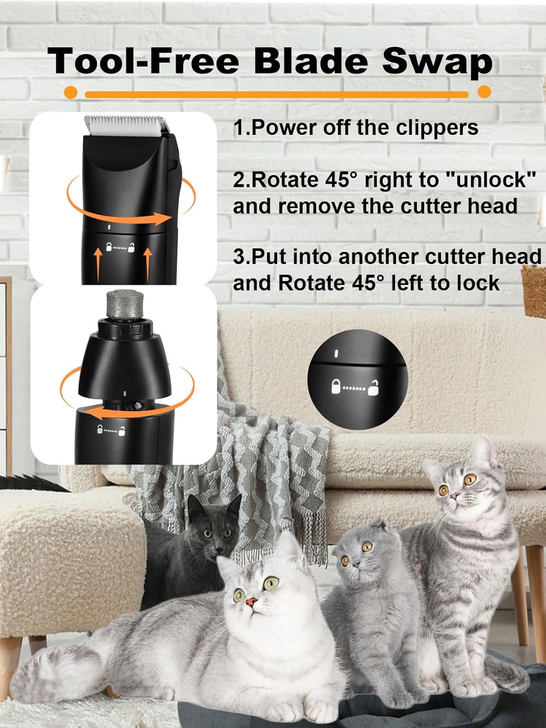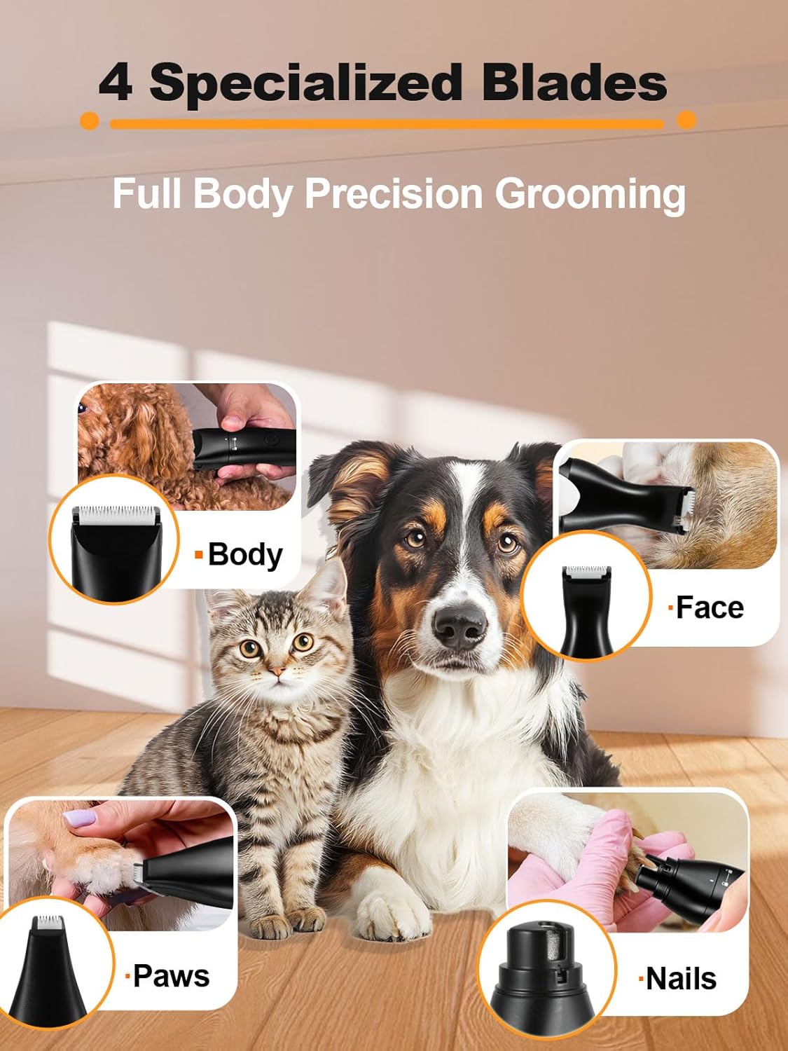 <br> Package Dimensions : 7.44 x 3.82 x 2.44 inches; 0.32 ounces <br> Item model number : 205 <br> Batteries : 1 C batteries required. (included) <br> Date First Available : January 22, 2025 <br> Manufacturer : Vitoki <br> ASIN : B0DR8LM4QF <br> Best Sellers Rank: #121,158 in Pet Supplies (See Top 100 in Pet Supplies) #425 in Dog Grooming Clippers <br> Customer Reviews: 3.9 3.9 out of 5 stars (63) var dpAcrHasRegisteredArcLinkClickAction; P.when('A', 'ready').execute(function(A) { if (dpAcrHasRegisteredArcLinkClickAction !== true) { dpAcrHasRegisteredArcLinkClickAction = true; A.declarative( 'acrLink-click-metrics', 'click', { "allowLinkDefault": true }, function (event) { if (window.ue) { ue.count("acrLinkClickCount", (ue.count("acrLinkClickCount") || 0) + 1); } } ); } }); P.when('A', 'cf').execute(function(A) { A.declarative('acrStarsLink-click-metrics', 'click', { "allowLinkDefault" : true }, function(event){ if(window.ue) { ue.count("acrStarsLinkWithPopoverClickCount", (ue.count("acrStarsLinkWithPopoverClickCount") || 0) + 1); } }); }); <br>4 Specialized Blades for Precision Grooming: Tackle every curve and crevice of your pet! This dog grooming kit includes a Standard Blade for body fur, Narrow Blade for face/ears, a dog paw trimmer-optimized Small Blade, and Nail Grinder. Perfect as cat clippers for delicate areas or a dog shaver for light trimming on small to medium pets.<br>Smart Single-Button Control: Your ultimate small animal clippers in one! One press starts High Speed (7000 RPM) for quick trimming, press again for Gentle Low Speed (5000 RPM) around sensitive zones. Final press powers off instantly – no confusing modes!<br>Compact Yet Powerful: The low vibration motor fits in any palm (5.9" tall), making these cat trimmer ideal for kittens and a portable dog paw trimmer for travel. Designed for maintenance trims, large breeds with thick coats or heavy matted fur may take a longer time for full grooming.Patience creates the perfect trim!<br>Tool-Free Blade Swap: 1.Rotate Right 45° to align the blade’s mark with the unlock symbol,Lift Up to remove the blade. Insert the new blade into the slot,Rotate Left 45°to the lock symbol. The cat grooming kit's self-aligning design clicks securely – no forced twisting!<br>Waterproof & Easy Clean: Rinse blades under tap after use the pet grooming clippers. Durable stainless steel resists rust – just wipe dry and apply included lubricant for long-lasting sharpness.<br>All-in-One Grooming Solution: This pet grooming tools has everything – 4 blades, 3 combs, USB-C cable, brush, oil, storage case. Cover every trimming need –face,ears,body,paws, nails, and sensitive areas.