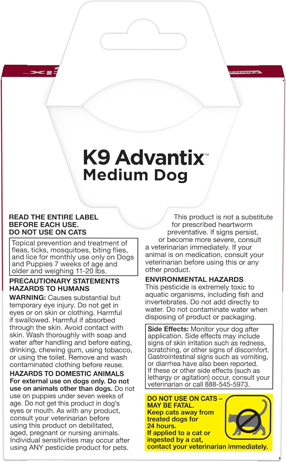 K9 Advantix kills and repels fleas, ticks, mosquitoes, biting flies, and lice. Simpler than a flea collar and hard-to-swallow pills, this topical formula works within 12 hours of initial application to stop existing flea infestations on dogs and prevent new ones by killing adult fleas on contact before they lay new eggs or bite your dog. K9 Advantix offers fast relief at an excellent value, so you and your dog can get back to the things you love most. Your dog should be at least 7 weeks old and weigh 11-20 lbs. to use K9 Advantix Medium Dog. Use as directed by label. Do not use on cats.