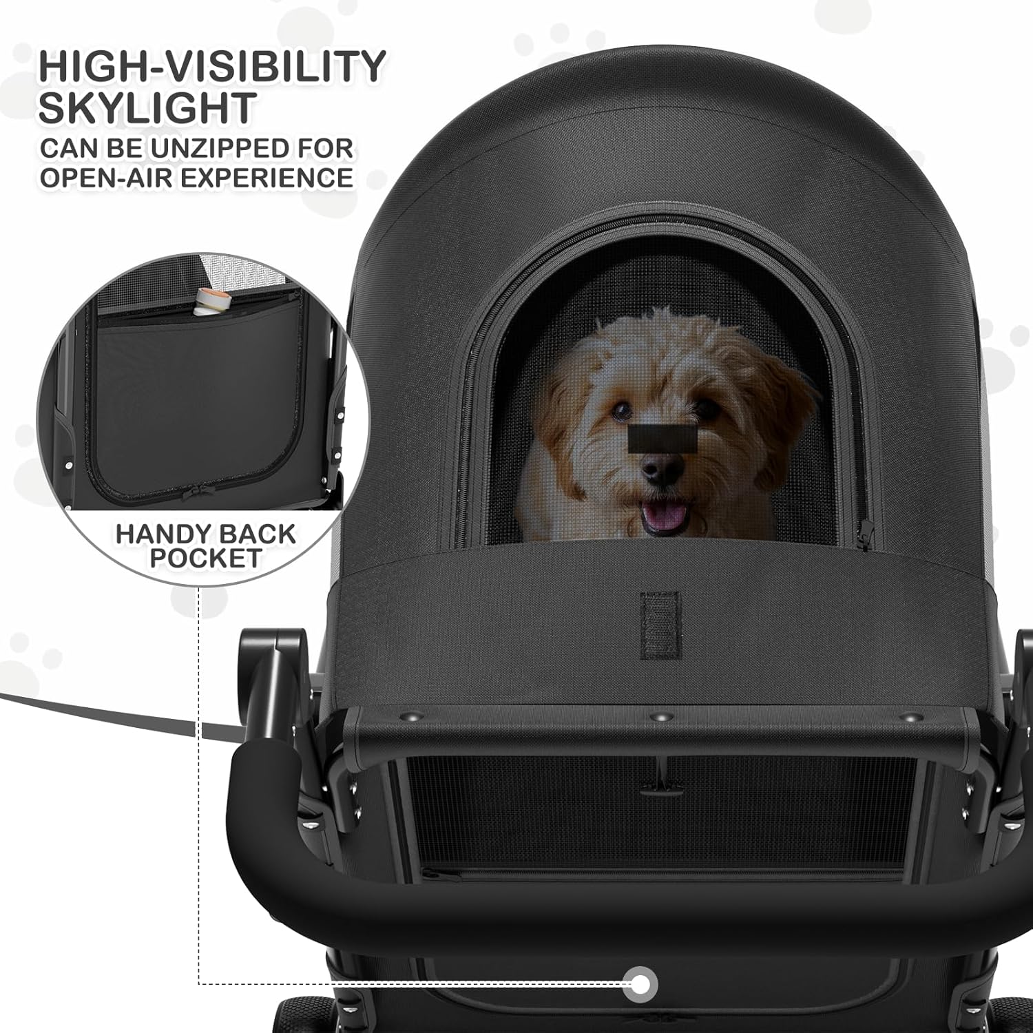 <br>Oxford<br>Extra Large Capacity for Multiple or Large Pets - This spacious pet wagon accommodates all sizes comfortably. Whether it’s a trip to the vet, a subway ride, or outdoor adventures, our large cabin ensures your pet's comfort and safety, making every journey enjoyable.<br>Enhanced Durable and Stable Design - Crafted with thickened iron pipes and durable rubber wheels featuring shock absorbers, our stroller guarantees a smooth, stable ride. The safety-centric design includes a rear wheel locking system and 360° rotating front wheels, ensuring easy navigation over various terrains and additional security for your pet.<br>Adjustable Multi-Position Handle - Experience the perfect blend of comfort and adaptability with our pet stroller's adjustable multi-position handle. Tailored to your height and preference, it ensures a comfortable strolling experience for pet owners of all sizes.<br>Breathable Mesh Windows with Skylight - Our pet stroller features waterproof Oxford fabric and mesh screen windows, offering your pet a panoramic view and gentle breezes while ensuring ventilation and protection from mosquitoes. The unique skylight can be unzipped for an open-air experience.<br>Convenient Storage Solution - Our pet stroller comes with a handy back pocket, perfect for storing essentials like water bottles, umbrellas, and smartphones, ensuring everything you need is within easy reach.<br>Effortless Portability - With its simple folding mechanism, our stroller collapses into a compact size for convenience and is light enough to carry anywhere with ease.<br>Designed for Comfort - Our dog stroller's ergonomically curved handlebars with foam padding provide a soft and comfortable grip, minimizing wrist and forearm strain on long walks, and offering ease of maneuverability over diverse terrains.<br>Dual-Entry Design for Elderly or Injured Pets - Tailored for the comfort of older or joint-impaired pets, our stroller includes dual zipped doors at the front and rear. This design facilitates easy access for pets, eliminating the need to turn around when entering or exiting, making it a thoughtful gift for your beloved companions.