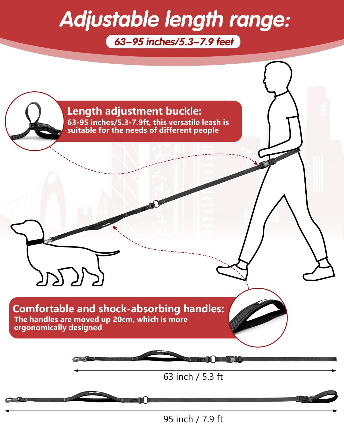 <br> Product Dimensions : 95 x 1 x 0.04 inches; 8.47 ounces <br> Item model number : HGD3270 <br> Date First Available : October 28, 2024 <br> Manufacturer : WANFIRE <br> ASIN : B0DL55ZBK5 <br> Best Sellers Rank: #8,472 in Pet Supplies (See Top 100 in Pet Supplies) #5 in Dog Hands Free Leashes <br> Customer Reviews: 4.2 4.2 out of 5 stars (1,121) var dpAcrHasRegisteredArcLinkClickAction; P.when('A', 'ready').execute(function(A) { if (dpAcrHasRegisteredArcLinkClickAction !== true) { dpAcrHasRegisteredArcLinkClickAction = true; A.declarative( 'acrLink-click-metrics', 'click', { "allowLinkDefault": true }, function (event) { if (window.ue) { ue.count("acrLinkClickCount", (ue.count("acrLinkClickCount") || 0) + 1); } } ); } }); P.when('A', 'cf').execute(function(A) { A.declarative('acrStarsLink-click-metrics', 'click', { "allowLinkDefault" : true }, function(event){ if(window.ue) { ue.count("acrStarsLinkWithPopoverClickCount", (ue.count("acrStarsLinkWithPopoverClickCount") || 0) + 1); } }); }); <br>🐶🦮【Excellent After-Sales Support - We're Always Here for You】Includes: 1 black dog leash. Our customer service team is ready to answer any questions or concerns. We offer 12 months of product warranty. Please contact us promptly if any issues arise.<br>🐶🦮【Hands-Free Dog Leash – Wear It Your Way】The dog leash length ranges from 5.3-7.9ft (63-95 inches), and the dog leash can be replaced with "crossbody dog leash, waist dog leash or handheld dog leash" according to your needs. Flexible functional changes can enhance various interactions between you and your pet.<br>🐶🦮【Heavy-Duty & Built to Last – Up to 110lbs Support】The weight of the waist dog leash is about 260g, which can support dog weights up to 110lbs/50Kg. Made of nylon and polyester fibers, it has high-strength tear resistance and long-lasting durability. The 360° rotating lock is made of aerospace aluminum alloy to prevent breakage. The maximum tensile strength is 196kgf, ensuring freedom of movement while preventing the risk of leash breakage and losing the dog.<br>🐶🦮【Dual Padded Handles for Maximum Comfort & Control】Both handles feature soft neoprene foam padding, reducing strain on your waist and hands. Ideal for active dogs, the leash absorbs shocks and impacts, offering maximum comfort even during long walks or runs.<br>🐶🦮【2-in-1 Dog Car Seatbelt – Travel Safely】Equipped with a car safety buckle, this leash easily connects to your car’s seatbelt socket. It keeps your dog secure and stable during car rides, reducing travel anxiety and ensuring pet safety on the go.<br>🐶🦮【Reflective Design for Nighttime Safety】Featuring double-sided reflective tape, this leash enhances visibility in low-light conditions. Whether you're out for a night run, an early morning walk, or an evening stroll, it provides an extra layer of safety for you and your dog.