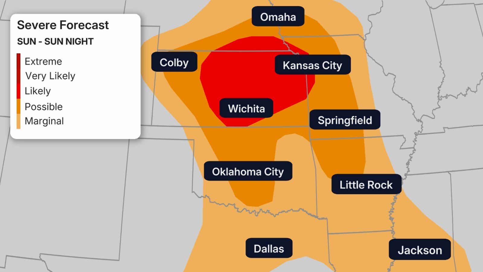 The threat of supercell thunderstorms is in play in the Central and Southern Plains, especially in parts of Kansas, Nebraska and Missouri.