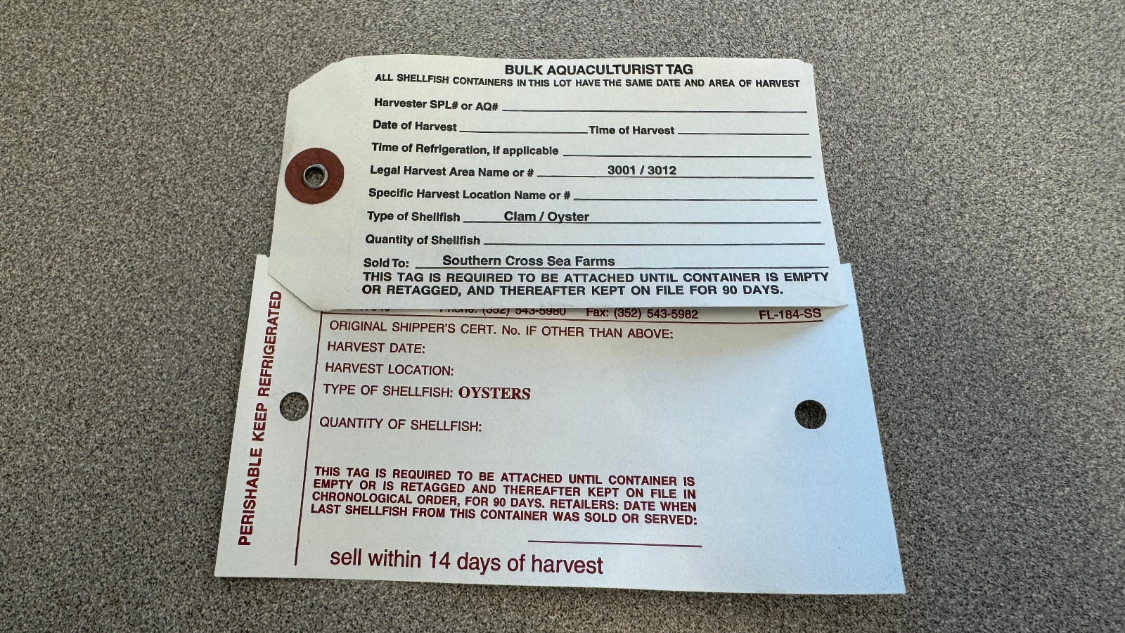 Shellfish tags used to keep track of where and when shellfish is harvested.