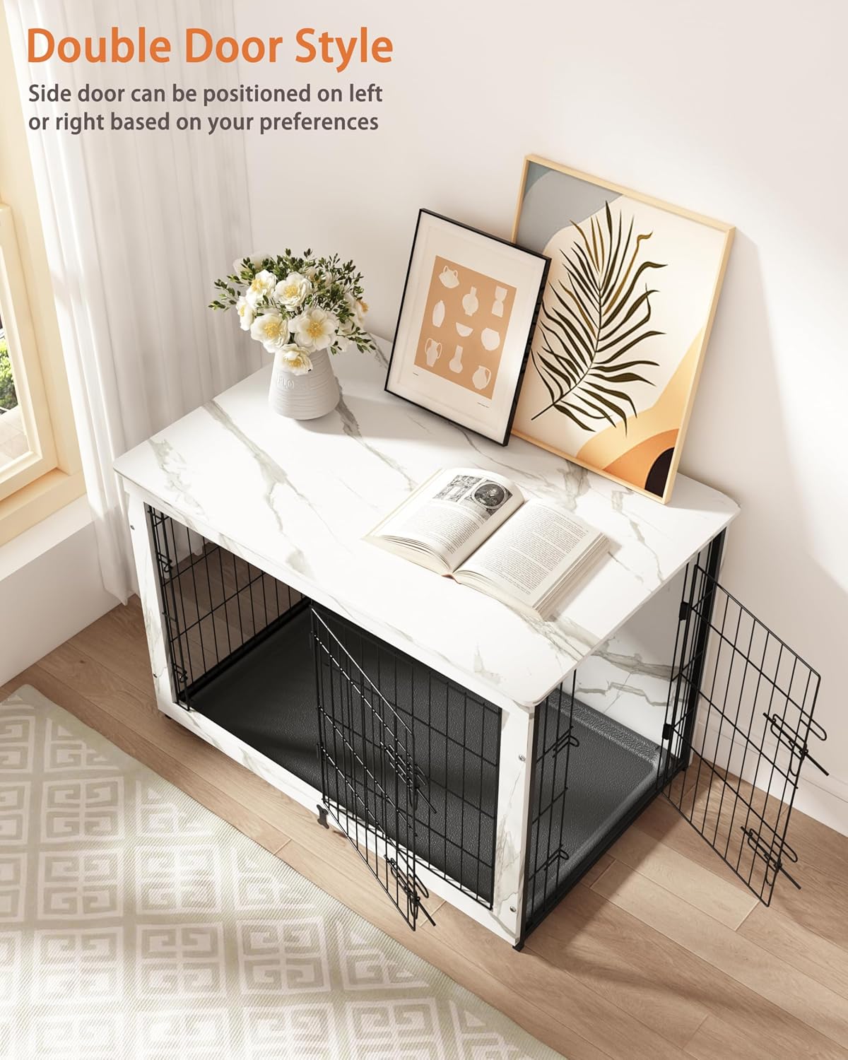 【Durable Material】: This dog crate is made of high-density fiberboard, which is more durable than fragile particle board. The high-quality reinforced steel mesh has been treated with rust prevention. And double doors and double locks are more sturdy and durable.