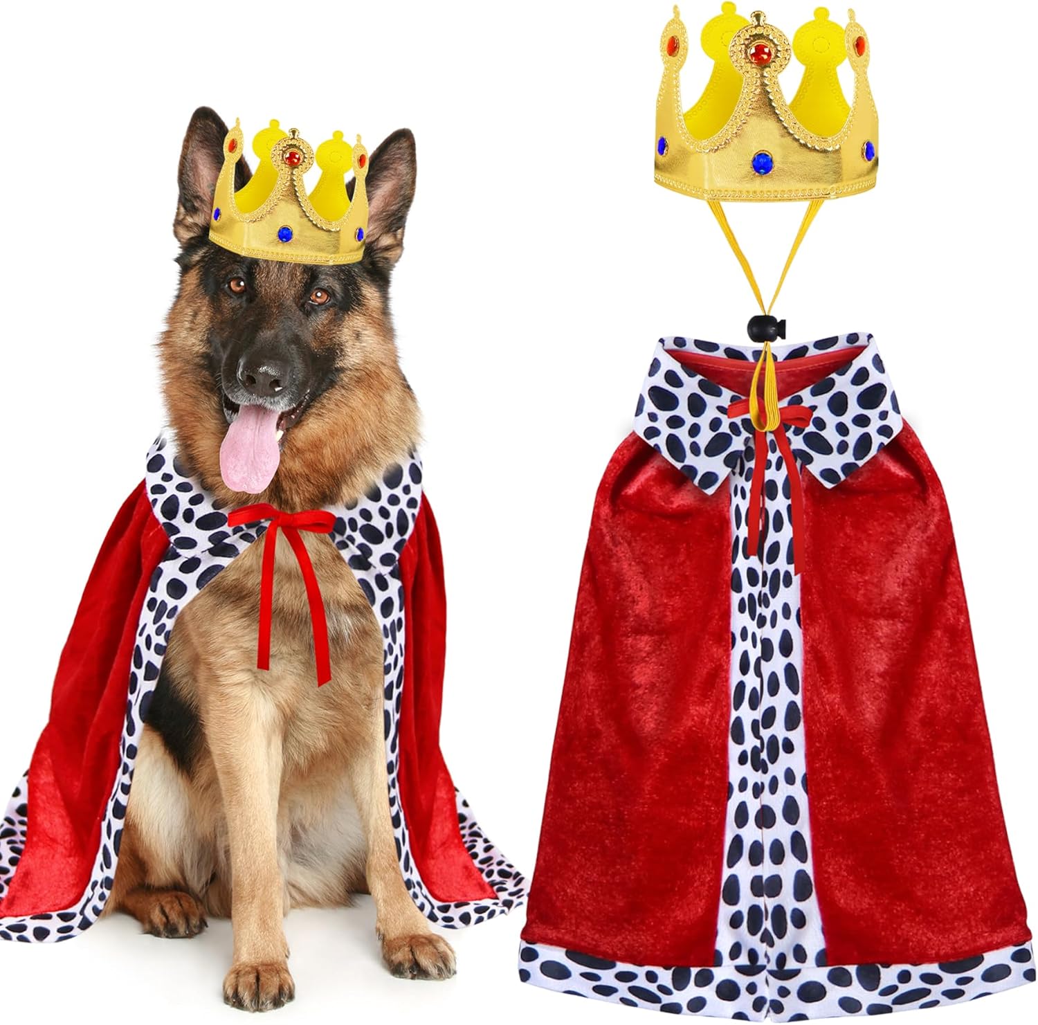 <br> Package Dimensions : 6.85 x 6.02 x 1.61 inches; 4.16 ounces <br> Item model number : Dog King Costume <br> Date First Available : September 6, 2024 <br> Manufacturer : GOYOSWA <br> ASIN : B0DCBVL9K1 <br> Best Sellers Rank: #13,161 in Pet Supplies (See Top 100 in Pet Supplies) #80 in Dog Costumes <br> Customer Reviews: 4.3 4.3 out of 5 stars 90 ratings var dpAcrHasRegisteredArcLinkClickAction; P.when('A', 'ready').execute(function(A) { if (dpAcrHasRegisteredArcLinkClickAction !== true) { dpAcrHasRegisteredArcLinkClickAction = true; A.declarative( 'acrLink-click-metrics', 'click', { "allowLinkDefault": true }, function (event) { if (window.ue) { ue.count("acrLinkClickCount", (ue.count("acrLinkClickCount") || 0) + 1); } } ); } }); P.when('A', 'cf').execute(function(A) { A.declarative('acrStarsLink-click-metrics', 'click', { "allowLinkDefault" : true }, function(event){ if(window.ue) { ue.count("acrStarsLinkWithPopoverClickCount", (ue.count("acrStarsLinkWithPopoverClickCount") || 0) + 1); } }); }); <br>Dog King Costume: You will received 1 red dog king cloak and 1 gold dog king crown. With these dog Halloween costumes, your dog will look like a cute king or prince on Halloween party and make some laugh. Your dog would not miss the special Halloween.<br>Multiple Sizes: This set of dog halloween costumes is designed in 3 sizes. Please measure the neck circumference and the back length for your dog before purchasing.<br>Premium & Soft Material: The king dog costume is made of super soft polyester, comfortable to wear. It would not annoy your dog and let your dog enjoy Halloween party with you.<br>Easy to Wear: The Halloween dog costumes are designed with 2 straps for tying the neck, which will not easy to fall off. The dog king crown comes with an adjustable strap that would fit your pets head better.<br>Wide Application: The dog king costume is ideals for Halloween costumes, Halloween Party, King and Queen Day, King Prince Party, Christmas present, holiday, photo props, daily wear and so on.