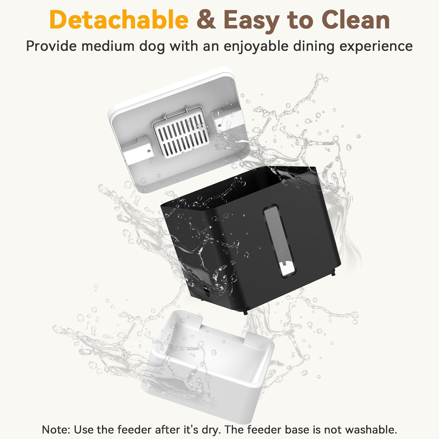 <p class="aplus-answer aplus-p2"> The automated dog feeder features anti-jam mechanics, a sealed lid, and a moisture-control desiccant box to prevent food clumping </p> <p class="aplus-answer aplus-p2"> It supports dry kibble sized between 2–12 mm (0.08–0.47 inch). Wet food or large freeze-dried chunks are not recommended </p>