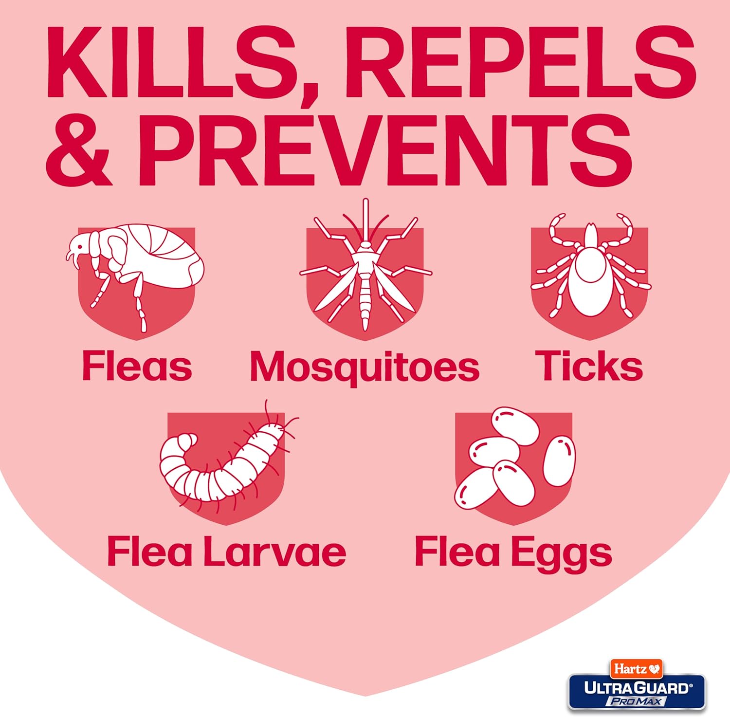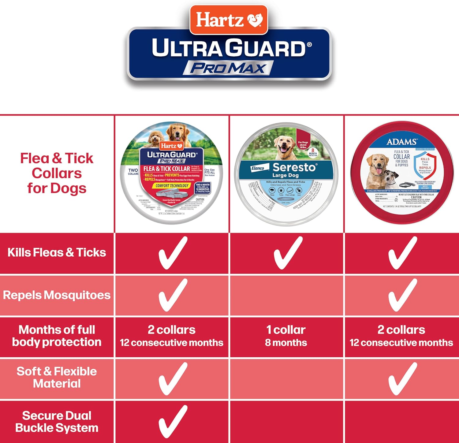 Get your pup the best pest protection with the Hartz UltraGuard ProMax Flea & Tick Collar for Dogs and Puppies 12 weeks and older. This collar kills flea & ticks and prevents flea eggs from hatching. The unique, patented collar design achieves maximum comfort with the soft and flexible texture, while the Dual Buckle System ensures the collar remains securely fastened. The ProMax Collar does not lose its effectiveness in water, so your playful pup can still enjoy swim time, baths, or playing in the rain. Two 6-month collars are in each tin to provide consecutive protection for up to 12 months, from head to tail. The ProMax Flea & Tick collar is One Size Fits All and is available in 3 different colors (gray, black and blue). Suitable for use on dogs and puppies 12 weeks or older.