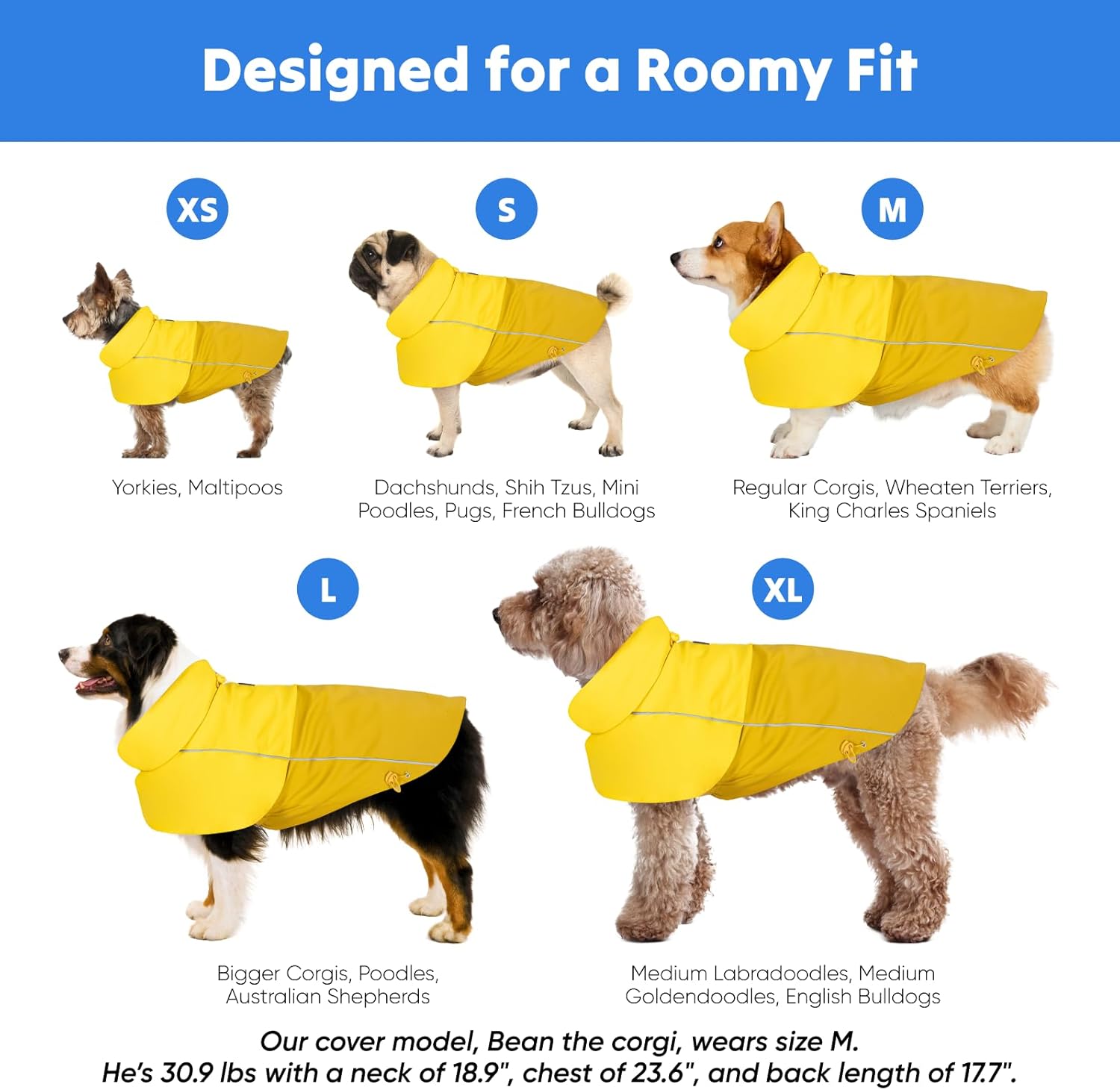 <br> Product Dimensions : 13.78 x 17.72 x 0.39 inches; 6.38 ounces <br> Item model number : MYellowRaincoat <br> Date First Available : December 8, 2024 <br> Manufacturer : Low Rider <br> ASIN : B0DPTV441G <br> Best Sellers Rank: #99,248 in Pet Supplies (See Top 100 in Pet Supplies) #174 in Dog Raincoats <br> Customer Reviews: 4.8 4.8 out of 5 stars 45 ratings var dpAcrHasRegisteredArcLinkClickAction; P.when('A', 'ready').execute(function(A) { if (dpAcrHasRegisteredArcLinkClickAction !== true) { dpAcrHasRegisteredArcLinkClickAction = true; A.declarative( 'acrLink-click-metrics', 'click', { "allowLinkDefault": true }, function (event) { if (window.ue) { ue.count("acrLinkClickCount", (ue.count("acrLinkClickCount") || 0) + 1); } } ); } }); P.when('A', 'cf').execute(function(A) { A.declarative('acrStarsLink-click-metrics', 'click', { "allowLinkDefault" : true }, function(event){ if(window.ue) { ue.count("acrStarsLinkWithPopoverClickCount", (ue.count("acrStarsLinkWithPopoverClickCount") || 0) + 1); } }); }); <br>WATERPROOF: Our dog jacket is made with 100% waterproof and windproof high quality polyester to keep your furry friends dry in rainy weather<br>COMFORTABLE: The entirely of our jackets interior is fully lined with a layer of mesh for breathability. This helps with ensure airflow and temperature regulation by allowing excess heat and moisture to escape, and ensures the fabric won't stick to your dog's skin<br>RELAXED FIT: Made for a roomy, our jacket has an adjustable neck and back feature for the perfect fit for small, medium, and large dogs like corgi, dachshund, frenchie, pug, and many other breeds . We also feature elastic smocking in the stomach for stretch, while providing maximum coverage. Please measure your pet based on our size chart. Note- since our jackets are made for a relaxed fit, our smallest size may be too roomy for the smallest dog breeds (dogs under 6 pounds). Please measure carefully<br>EXTRA COVERAGE: Offers additional coverage including a front splash guard layer, an oversized collar for full neck protection, and an extended back coverage for extra-long longs across each of our five sizes<br>DURABLE AND HARDWEARING: Made with thick material, our jacket is made for the elements. Made for protection against sun, wind, water, rain, and all weather, this lightweight and non-insulated jacket works great in milder climates on its own, or as a layering piece for colder climates.<br>THOUGHTFULLY DESIGNED: Our jacket is custom designed, with hardware placement and jacket cut placed to avoid potty accidents. You don't have to worry about pee and poo splatter!<br>REFELCTIVE: Feel safe at night, in heavy rain, and inclement weather We added reflective strips on the left and right side to keep your pet visible.<br>EASY CARE: Our puffer coat is hand washable, with waterproof hardware and a sturdy, rubber logo. Made with durable materials, our jacket will ensure wear across many seasons.<br>CONVENIENT HARNESS Portal: Our dog coat features a zipper opening with a portal in the back, making it easy to connect a leash or a harness. Our jacket is made to fit most harnesses, so you can go on walks, runs, and hikes in our jacket.