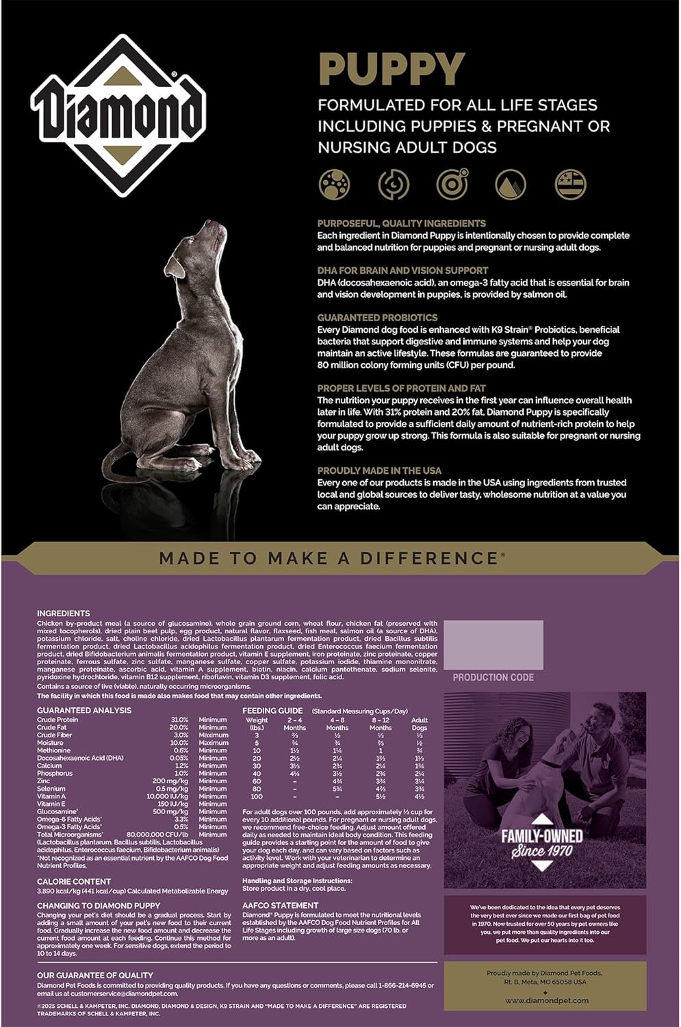 The nutrition a puppy receives in the first year can influence overall health later in life. Diamond Puppy is formulated with the help of veterinarians and a pet nutritionist to meet the special nutritional needs of rapidly growing puppies. Enhanced with DHA for proper brain and vision development, this recipe includes omega fatty acids, antioxidants and proper levels of protein and fat, to help puppies grow up strong. Diamond Puppy is also suitable for pregnant or nursing adult dogs.