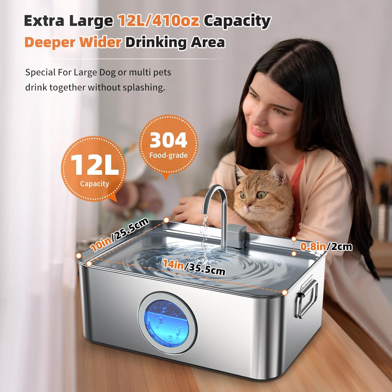 <br> Package Dimensions : 15.91 x 11.54 x 6.46 inches; 4.94 Pounds <br> Item model number : 12L Dog Fountain <br> Date First Available : January 15, 2025 <br> Manufacturer : Zuqqony <br> ASIN : B0DT4BTKBC <br> Best Sellers Rank: #10,505 in Pet Supplies (See Top 100 in Pet Supplies) #34 in Dog Fountains #628 in Cat Fountains <br> Customer Reviews: 4.2 4.2 out of 5 stars 189 ratings var dpAcrHasRegisteredArcLinkClickAction; P.when('A', 'ready').execute(function(A) { if (dpAcrHasRegisteredArcLinkClickAction !== true) { dpAcrHasRegisteredArcLinkClickAction = true; A.declarative( 'acrLink-click-metrics', 'click', { "allowLinkDefault": true }, function (event) { if (window.ue) { ue.count("acrLinkClickCount", (ue.count("acrLinkClickCount") || 0) + 1); } } ); } }); P.when('A', 'cf').execute(function(A) { A.declarative('acrStarsLink-click-metrics', 'click', { "allowLinkDefault" : true }, function(event){ if(window.ue) { ue.count("acrStarsLinkWithPopoverClickCount", (ue.count("acrStarsLinkWithPopoverClickCount") || 0) + 1); } }); }); <br>🐱3.2 Gallon/12L Capacity for Multi-pet Homes - Our stainless steel dog drinking fountain is upgraded to have large 3.2 Gallon capacity with deeper and wider drinking area. Perfect for large dogs or multiple pets to drink together. Reduces the frequency of refill for you while ensuring the daily water needs of your fur babies, promoting your lovely friends' kidney and urinary health.<br>🐶Premium & Safer SUS304 Stainless Steel - The dog water bowl dispenser is made of durable, rust and corrosion-resistant food-grade 304 stainless steel, which is firmer and dishwasher safe to clean and maintain. Ensuring a clean and safe water source for your furry-kids, allowing you to enjoy a more relaxed pet care experience.<br>🐱Visible Window + LED Indicator - Our pet water fountain is upgraded to have a transparent Window + red light reminder filling function. The transparent window for easy monitoring of water levels. When the water level reaches the lowest water level, the pump light will change from blue to red to reminder adding fresh water, and the pump will stop working to protect the motor.<br>🐶Super Quiet Water Pump & Faucet Design - Our automatic pet water dispenser features an ultra-quiet pump, which won't disturb your sleep, reading, or startle your pet. There are faucet and natural waterfall water flow modes, The waterfall water flow allows dogs to drink water in big gulps. The faucet will attract cats to drink more water.<br>🐱4-Stage Filtration Filtration System - The filtration system of pet water fountain includes 4 filter layers (non-woven fabric, ion-exchange resins, activated carbon and sponge) , which can filter dropping dirt debris and shedding fur effectively, so as to keep the water source clean and the healthy growth of pet. Tips: For your pet's health and to ensure the fountain works properly, we recommend replacing the filter and sponge every 2 weeks.<br>🐶Why Choose Us - Our large dog water fountain is with 4-stage filtration system to consistently provide your pet with fresh, healthy water. Ultra large 12L capacity for pet long time drinking and relaxed youself. The deeper and wider water tray and faucet to better meet different pets' drinking habits. Simple construction allows you to install remove and clean in one step.