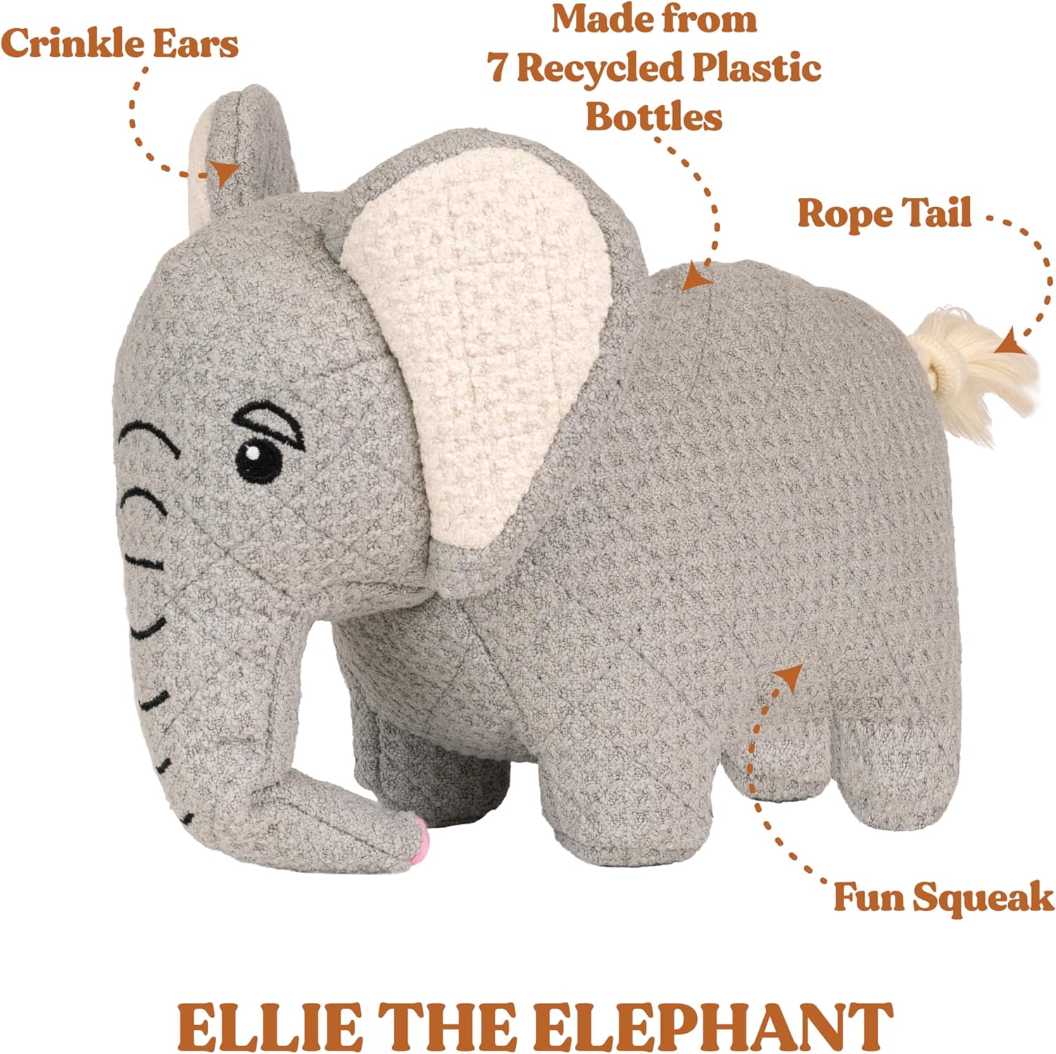 <br> Product Dimensions : 9.06 x 4.33 x 7.48 inches; 5.93 ounces <br> Date First Available : March 4, 2023 <br> Manufacturer : Playology <br> ASIN : B0BXB7BPCD <br> Best Sellers Rank: #45,702 in Pet Supplies (See Top 100 in Pet Supplies) #741 in Dog Chew Toys <br> Customer Reviews: 4.2 4.2 out of 5 stars 91 ratings var dpAcrHasRegisteredArcLinkClickAction; P.when('A', 'ready').execute(function(A) { if (dpAcrHasRegisteredArcLinkClickAction !== true) { dpAcrHasRegisteredArcLinkClickAction = true; A.declarative( 'acrLink-click-metrics', 'click', { "allowLinkDefault": true }, function (event) { if (window.ue) { ue.count("acrLinkClickCount", (ue.count("acrLinkClickCount") || 0) + 1); } } ); } }); P.when('A', 'cf').execute(function(A) { A.declarative('acrStarsLink-click-metrics', 'click', { "allowLinkDefault" : true }, function(event){ if(window.ue) { ue.count("acrStarsLinkWithPopoverClickCount", (ue.count("acrStarsLinkWithPopoverClickCount") || 0) + 1); } }); }); <br>Cute with a Cause: Adorable meets eco-friendly! Grrreen toys are not only crafted from 100% recycled plastic, but they’re also designed to turn heads. With their loveable looks and planet-saving purpose, these toys make the perfect fun and fashionable companion for your dog.<br>Ellie the Elephant is part of the Savanna collection and comes in multiple sizes, ensuring dogs big and small have the ideal playtime pal! The Jumbo size is perfect for pups 50lbs and above.<br>Long Lasting Play: Designed for endless snuggles and playtime, Grrreen toys are tough on fun, but gentle on the planet. With reinforced materials and stitching, these adorable plush toys are built for play, making them a must-have in your dog’s toy collection.<br>100% Recycled: Sustainable fun! Every Grrreen toy is crafted from 100% recycled plastic bottles, helping to clean up the planet one toy at a time.<br>Easy to Clean: Grrreen toys are designed to be hassle-free and easy to clean, making them perfect for both playtime and cleanup. Just toss the toy in the washing machine and tumble dry with low heat.
