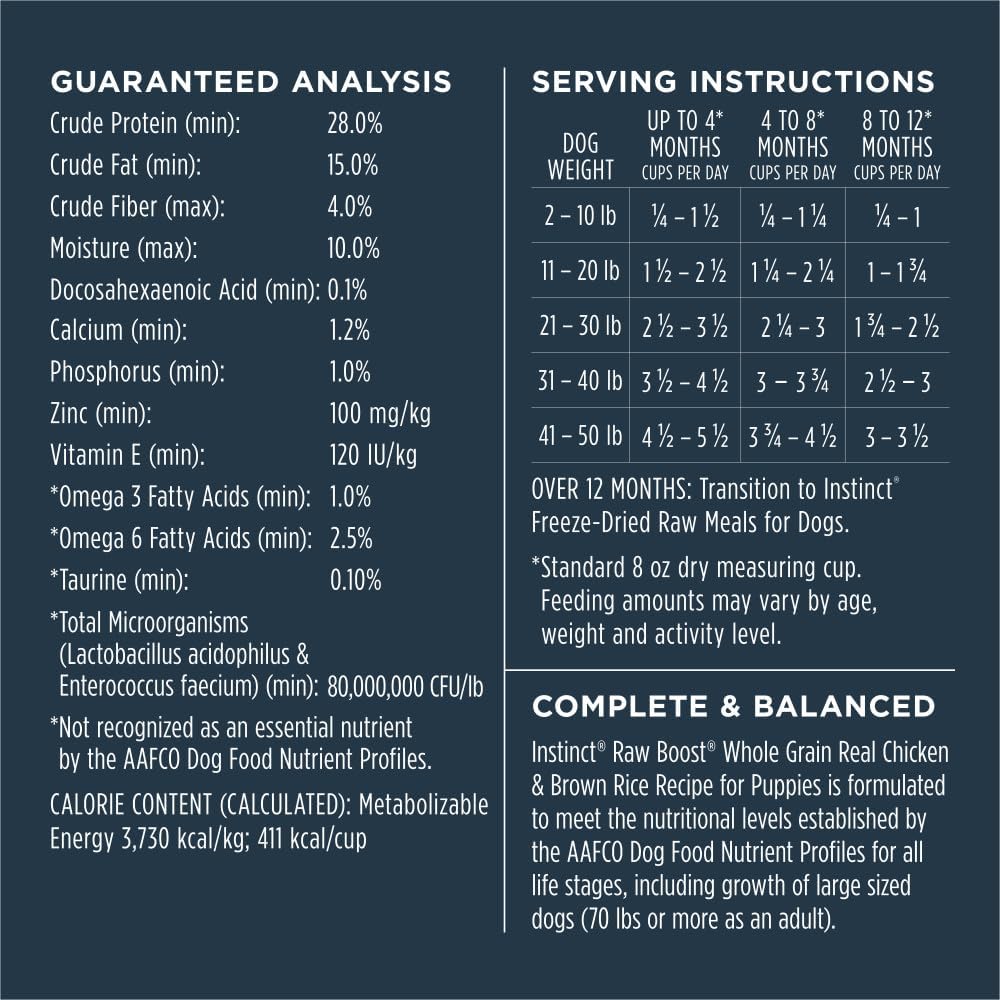 Instinct Raw Boost Whole Grain Real Chicken & Brown Rice Recipe for Puppies is a natural dry dog food made especially for growing pups. Cage-free chicken is the first ingredient, delivering the high-quality animal protein puppies need for energy, growth, and play. This recipe makes real animal proteins the #1 and #2 ingredients, complemented by nutrient-rich whole grains, fruits, and vegetables for balanced nutrition. Crafted without fillers, this wholesome recipe contains no corn, wheat, soy, potato, peas, lentils, by-product meals, artificial colors, or preservatives—ensuring your puppy receives only clean, natural nutrition. What makes Instinct Raw Boost unique is its combination of crunchy whole-grain kibble coated in freeze-dried raw with soft bites of freeze-dried raw chicken mixed in. This delicious blend provides bold flavor, enhanced nutrition, and a satisfying variety of textures your puppy will crave. Specially formulated for puppies, this recipe includes natural DHA for brain and eye development, plus optimal calcium and phosphorus levels to support strong bones and teeth. With protein-rich chicken, brown rice for natural fiber, and essential nutrients, this food is designed to fuel healthy growth and overall well-being. At Instinct, we believe in the power of raw to unlock your puppy’s potential. Proudly made in the USA with the finest ingredients from around the world, this recipe is complete & balanced for all life stages, including the growth of large-breed puppies (70 lbs or more as an adult).