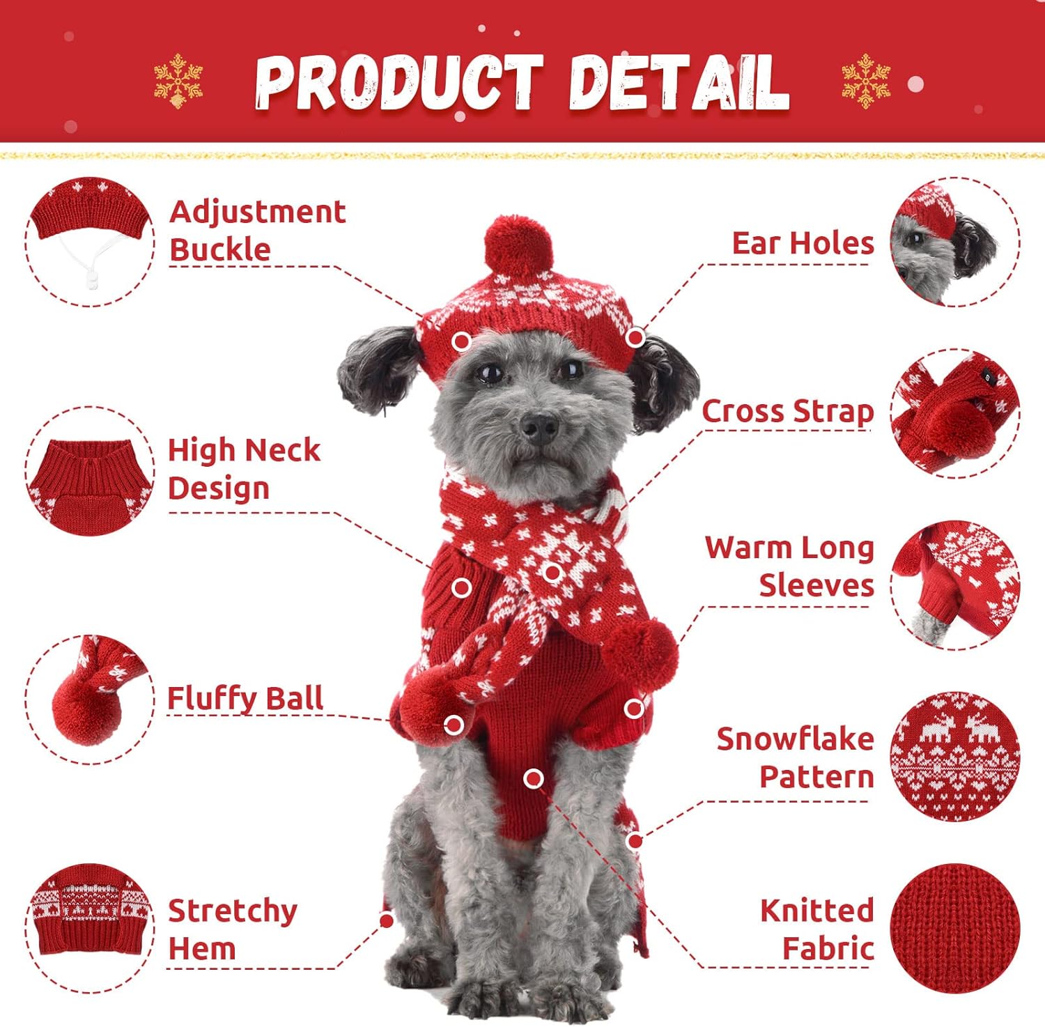 <br> Package Dimensions : 12.91 x 11.02 x 0.59 inches; 8.78 ounces <br> Item model number : MY21A012 <br> Date First Available : August 9, 2021 <br> Manufacturer : ABRRLO <br> ASIN : B09C5MFHX9 <br> Best Sellers Rank: #72,948 in Pet Supplies (See Top 100 in Pet Supplies) #516 in Dog Sweaters <br> Customer Reviews: 4.3 4.3 out of 5 stars 133 ratings var dpAcrHasRegisteredArcLinkClickAction; P.when('A', 'ready').execute(function(A) { if (dpAcrHasRegisteredArcLinkClickAction !== true) { dpAcrHasRegisteredArcLinkClickAction = true; A.declarative( 'acrLink-click-metrics', 'click', { "allowLinkDefault": true }, function (event) { if (window.ue) { ue.count("acrLinkClickCount", (ue.count("acrLinkClickCount") || 0) + 1); } } ); } }); P.when('A', 'cf').execute(function(A) { A.declarative('acrStarsLink-click-metrics', 'click', { "allowLinkDefault" : true }, function(event){ if(window.ue) { ue.count("acrStarsLinkWithPopoverClickCount", (ue.count("acrStarsLinkWithPopoverClickCount") || 0) + 1); } }); }); <br>3 PACK CHRISTMAS DOG COSTUMES SET:3 Pieces Christmas dog outfits include a dog Xmas sweater,a dog Xmas hat and a dog Xmas scraf,all are mainly red and white color,with knitted snowflake and elk pattern,very festive,suitable for Christmas Day,Christmas Eve and other major festivals<br>SOFT WARM CHRISTMAS DOG OUTFITS:The Xmas dog outfits are made of soft and comfortable fabrics,comfy, stretchy and skin-friendly.Your pup can run,jump,play without bothering him/her.Easy to put on and take off.The Christmas dog sweater sets are heavy than most keeping these fur babies warm in the winter weather<br>XMAS DOG SWEATER & DOG CAP & DOG SCARF:Turtleneck dog sweater is so cute and your baby is able to pee without getting his sweater dirty.The dog christmas hat is designed with Adjustment Buckle,Fluffy Ball and Ear Holes.One side of the dog christmas scarf has a Cross Strap and the other side is crossed and fixed<br>CUTE PET CHRISTMAS PHOTO SET:Cute! Adorable! Great for photos!The Dog Christmas Sweaters hats and scarfs set is super cute for your furbaby to wear for your christmas family photos or Christmas Card Pictures.Great for Christmas eve celebration or other holiday parties.Easy to wear<br>PROPER SIZE OF DOG COSTUMES:Size Large --- Dog sweater:Back length 14.57",Chest 17.32",Neck 13.75".The hat height 9.06",The hat width 6.30",Dog head girth 12.20"-14.17";Dog scarf neck 18.50",Dog scarf Length 27.95".Size L not means it will fit LARGE dogs,please measure your dog carefully to make sure the correct size before ordering