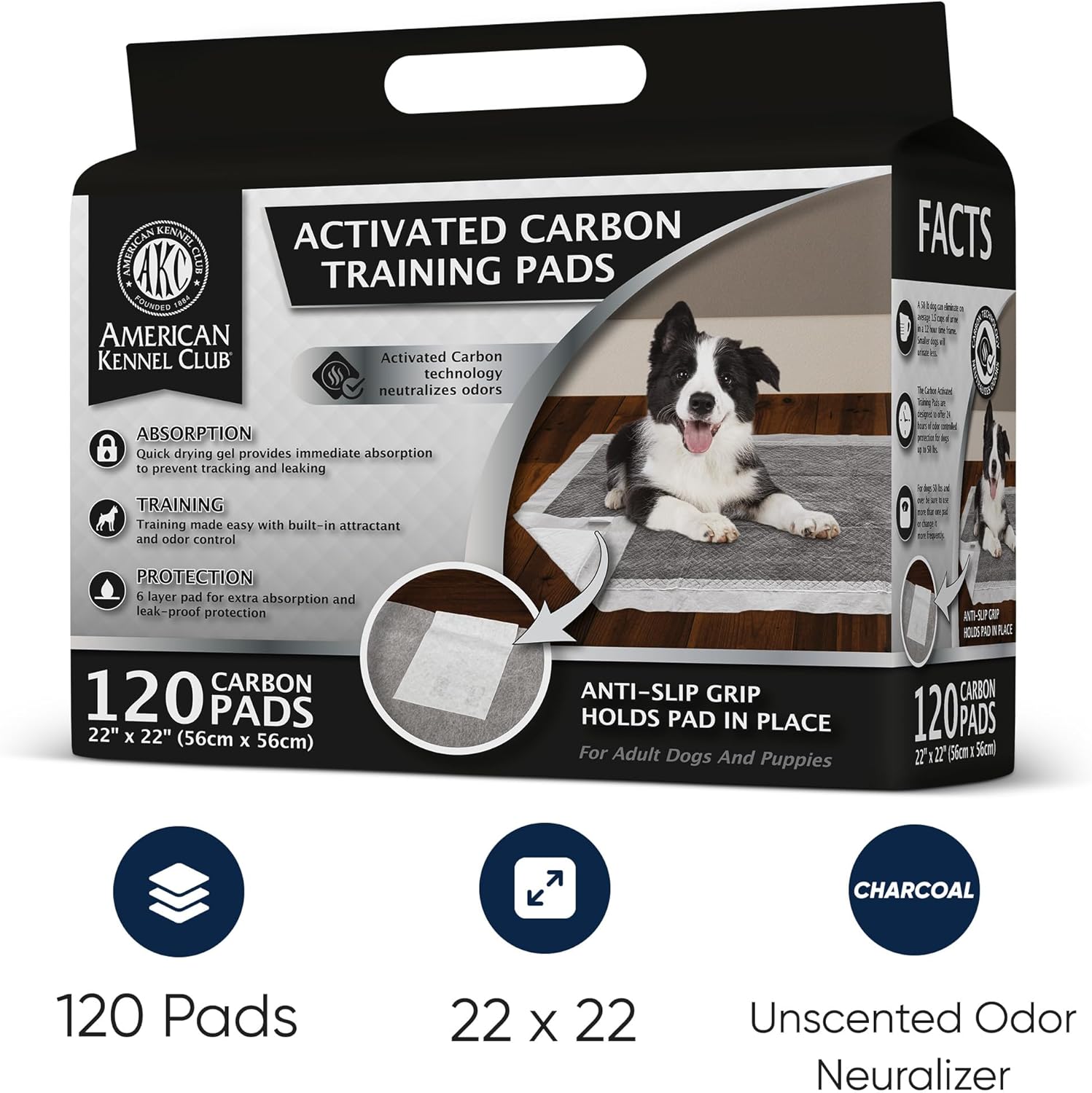Introducing the American Kennel Club Activated Charcoal Puppy Training Pads – the perfect solution to protect your home from those unwanted accidents! An activated charcoal technology helps absorb and neutralize odors while the quick-drying gel provides immediate absorption to prevent any tracking or leaking. The six layer composition pad offers extra absorption and protection, while the antislip adhesive backing sticker prevents your pup from dislodging the pad. And with a built in attractant only your pet can smell, training them is made easy – they will know exactly where to go! Available in a convenient 22 x 22 inch size, this inclusive puppy training pad is perfect for dogs up to 50 lbs, although we recommend using more than one pad or changing it more frequently for larger breeds. Keep your home fresh and clean and shop the American Kennel Club Activated Charcoal Puppy Training Pads today.