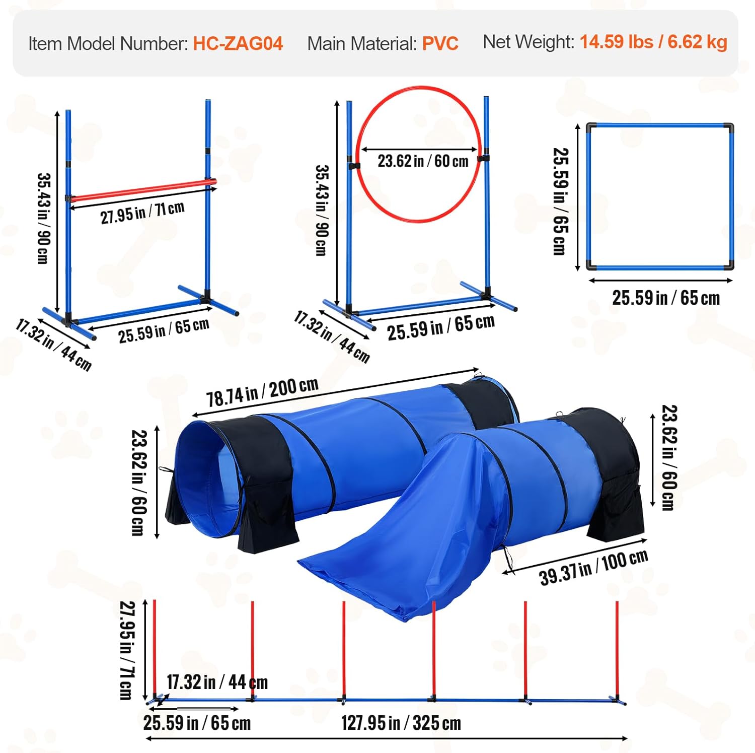 <br> Product Dimensions : 78.74 x 23.62 x 0.1 inches; 15.34 Pounds <br> Item model number : HC-ZAG04 <br> Date First Available : August 22, 2024 <br> Manufacturer : VEVOR <br> ASIN : B0DDXHY98M <br> Best Sellers Rank: #154,948 in Pet Supplies (See Top 100 in Pet Supplies) #123 in Dog Agility Jumps <br> Customer Reviews: 4.0 4.0 out of 5 stars 17 ratings var dpAcrHasRegisteredArcLinkClickAction; P.when('A', 'ready').execute(function(A) { if (dpAcrHasRegisteredArcLinkClickAction !== true) { dpAcrHasRegisteredArcLinkClickAction = true; A.declarative( 'acrLink-click-metrics', 'click', { "allowLinkDefault": true }, function (event) { if (window.ue) { ue.count("acrLinkClickCount", (ue.count("acrLinkClickCount") || 0) + 1); } } ); } }); P.when('A', 'cf').execute(function(A) { A.declarative('acrStarsLink-click-metrics', 'click', { "allowLinkDefault" : true }, function(event){ if(window.ue) { ue.count("acrStarsLinkWithPopoverClickCount", (ue.count("acrStarsLinkWithPopoverClickCount") || 0) + 1); } }); }); <br>Enhance Your Dog's Agility: Our kit includes a 27.95-inch wide jump bar, a 23.62-inch diameter jump ring, 6 base poles, a 78.74-inch open tunnel, a 39.37-inch semi-enclosed tunnel, and a pause box. Perfect for training your dog’s agility and obedience, strengthening your bond, and having fun.<br>Premium and Durable: Bars are made from sturdy PVC, ensuring stability and resistance to deformation. The foldable tunnel is crafted from tear-resistant polyester, with side pockets for added stability, and is resistant to damage from your dog’s paws.<br>Portable and Easy to Install: No tools are needed for setup—simply use the connectors and clips for quick assembly and disassembly. Adjust the height of the jump bar and ring with side clips. Lightweight and compact, it includes storage bags for easy transport and indoor or outdoor use.<br>What’s Included: Instruction manual x1, training bag x1, whistle x1, folding bowl x1, jump ring x1, semi-enclosed tunnel x1, open tunnel x1, sandbags x3, pole storage bag x1, tunnel storage bag x1, pause box x4, base poles x6, action poles x2, weaving poles x6. Everything you need for a complete agility training setup, ready for immediate use and fun.<br>Flexible Use Anywhere: The agility training set is lightweight and portable, ideal for use in various settings including indoor living rooms, balconies, attics, or expansive outdoor spaces like yards, lawns, and parks.
