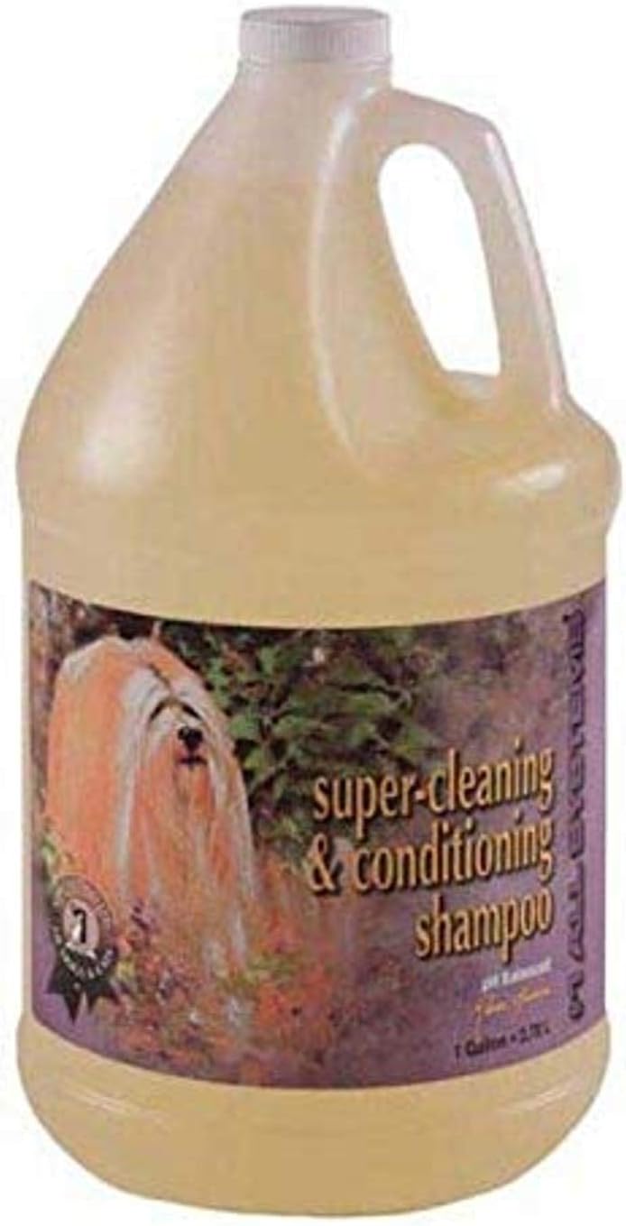 This cleaning and conditioning shampoo cleans thoroughly without harsh detergents. Safe enough to be used every day. Extra-gentle, low-sudsing formula. Rinses out completely, leaving no residue. Cleaning and conditioning shampoo comes in 1-gallon size. Dilution: Shampoo dilutes a minimum of 2:1, but with bathing system type equipment it dilutes up to 10:1. Safe for puppies and kittens. Ingredients are deionized water, ammonium lauryl sulfate, cocamidopropyl betaine, cocamide dea, propylene glycol, glycerin, DM hydantoin, fragrance, citric acid, F D and C yellow #6. Directions for use-Shake well before using. Wet pet’s coat completely with warm water. Dispense a generous amount of shampoo into palm of hand and thoroughly massage into pet’s coat beginning at head and working back towards the tail. Avoid getting into eyes. Rinse completely. Repeat as necessary. Measures 12-inch length by 6-inch height by 6-inch width.