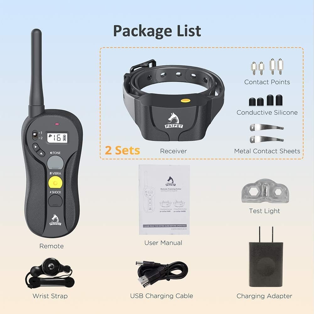 <br> Product Dimensions : 16 x 5.04 x 0.1 inches; 1.1 Pounds <br> Item model number : P Collar 640 <br> Batteries : 1 Lithium Polymer batteries required. (included) <br> Date First Available : August 30, 2022 <br> Manufacturer : Shenzhen Patpet Technology Co.,Ltd <br> ASIN : B0BCFV8QGW <br> Best Sellers Rank: #20,429 in Pet Supplies (See Top 100 in Pet Supplies) #128 in Electronic Training Collars <br> Customer Reviews: 4.4 4.4 out of 5 stars 512 ratings var dpAcrHasRegisteredArcLinkClickAction; P.when('A', 'ready').execute(function(A) { if (dpAcrHasRegisteredArcLinkClickAction !== true) { dpAcrHasRegisteredArcLinkClickAction = true; A.declarative( 'acrLink-click-metrics', 'click', { "allowLinkDefault": true }, function (event) { if (window.ue) { ue.count("acrLinkClickCount", (ue.count("acrLinkClickCount") || 0) + 1); } } ); } }); P.when('A', 'cf').execute(function(A) { A.declarative('acrStarsLink-click-metrics', 'click', { "allowLinkDefault" : true }, function(event){ if(window.ue) { ue.count("acrStarsLinkWithPopoverClickCount", (ue.count("acrStarsLinkWithPopoverClickCount") || 0) + 1); } }); }); <br>3 Training Modes: Beep, Vibration and 1 to 16 levels Static<br>Blind Operation: The remote button can be distinguished by touch<br>Waterproof: The receiver is IPX7 waterproof and the remote is IPX5 rainproof<br>Long Battery Life: The rechargeable battery provides uninterrupted dog training<br>Adjustable Belt: It is size adjustable for different dogs