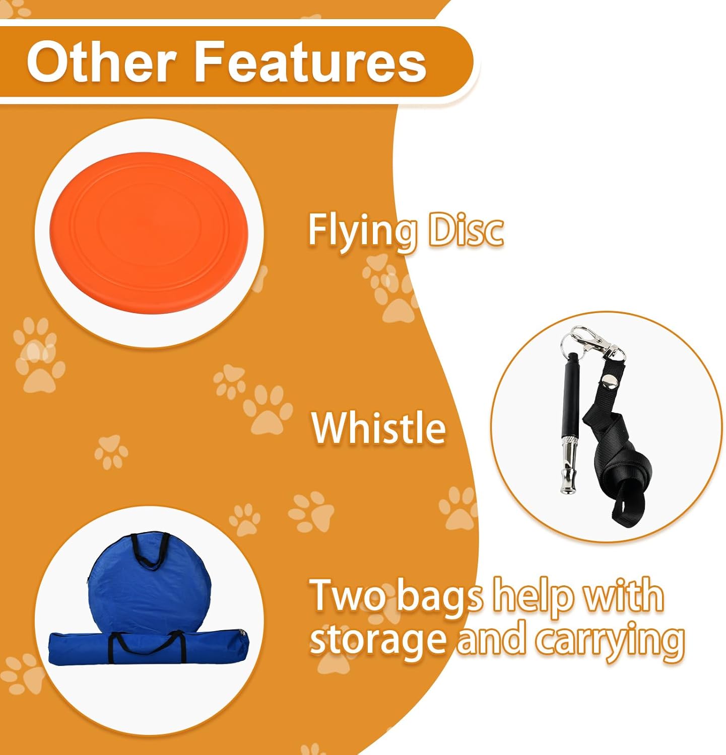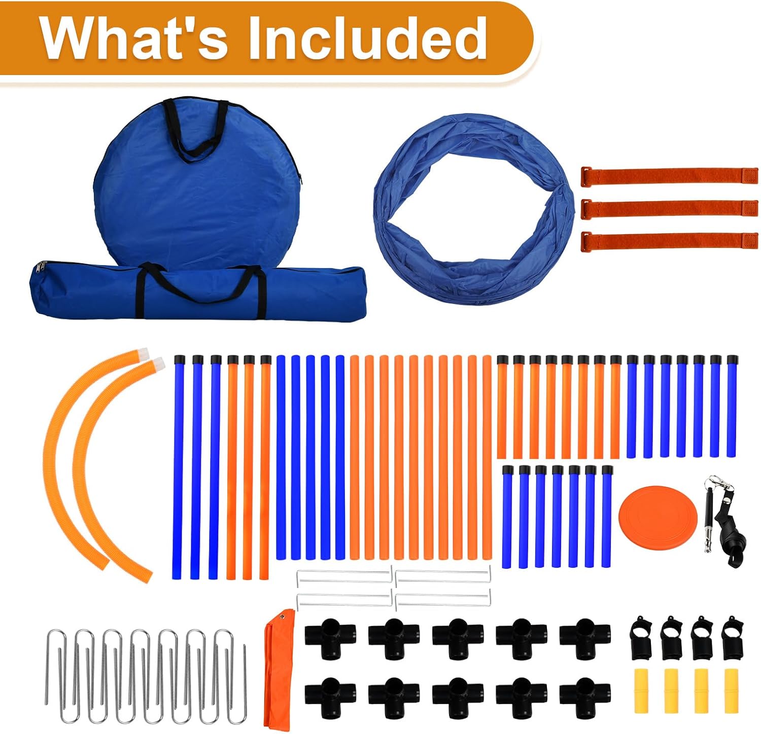 What You’ll Get: Comes with 6 woven poles, tire jump, hurdle jump, tunnel, pause box, flying disc, and whistle; Includes ground nails and requires no other tools for easy installation and well fixing; Two bags help you storage and carry anywhere easily