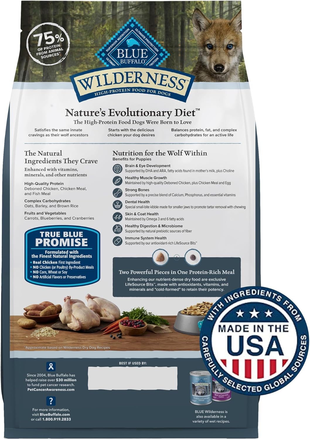 Contains: One (1) 4.5-lb bag of BLUE Wilderness High-Protein Natural Dry Puppy Food, Chicken Recipe