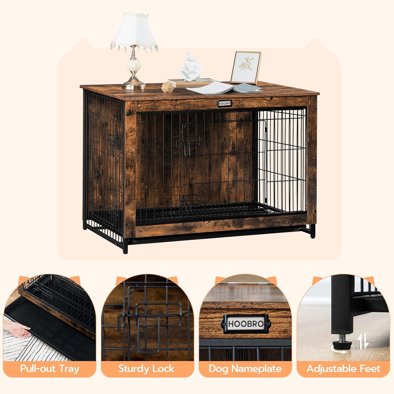 <br> Product Dimensions : 38.6 x 25.6 x 26.9 inches; 41.85 Pounds <br> Item model number : BF982GW03G1 Dog Crate Furniture <br> Date First Available : October 22, 2022 <br> Manufacturer : HOOBRO <br> ASIN : B09XDZ2J64 <br> Best Sellers Rank: #19,934 in Pet Supplies (See Top 100 in Pet Supplies) #14 in Furniture-Style Dog Crates <br> Customer Reviews: 4.1 4.1 out of 5 stars 795 ratings var dpAcrHasRegisteredArcLinkClickAction; P.when('A', 'ready').execute(function(A) { if (dpAcrHasRegisteredArcLinkClickAction !== true) { dpAcrHasRegisteredArcLinkClickAction = true; A.declarative( 'acrLink-click-metrics', 'click', { "allowLinkDefault": true }, function (event) { if (window.ue) { ue.count("acrLinkClickCount", (ue.count("acrLinkClickCount") || 0) + 1); } } ); } }); P.when('A', 'cf').execute(function(A) { A.declarative('acrStarsLink-click-metrics', 'click', { "allowLinkDefault" : true }, function(event){ if(window.ue) { ue.count("acrStarsLinkWithPopoverClickCount", (ue.count("acrStarsLinkWithPopoverClickCount") || 0) + 1); } }); }); <br>Multi-functional: This dog crate furniture is endowed with multi-purpose use for its furniture look. It can be a doghouse as well as be an end table, tea table or nightstand. Why not put a potted plant on top or place some pet supplies? Modern rustic look makes this pet cage compatible with your home<br>Double Openings and Pull-Out Tray: This furniture-style dog kennel indoor has front and side openings for access.The intensive bottom net of this dog kennel protects your pet's feet from injuries, and the pull-out tray can effectively prevent the garbage from falling, which is convenient for you to clean up<br>Ample Activity Space: The overall size is 38.6"L x 25.6"W x 26.9"H, and the size of inner house is 32.9"L x 23.8"W x 23.2"H. This dog crate loads up to 90 lb, highly suitable for medium and large dogs. Please confirm the size of your dog before purchasing this dog cage<br>Sturdy and Chew-Resistant: It is constructed of particleboard and steel, featuring easy care, strong stability and chew-resistance for pet-safe durability and long service life. We simplified assembly methods and steps and with numbered parts and comprehensible instructions, you can assemble this wooden dog crate easily<br>Warm Home for Your Dog: HOOBRO’s comfortable kennel is a warm home, which elevates peace and relaxation for your dog.so it can enjoy time in the end table dog crate when you are out without destroying anything in the house and will happily wait for your back. It can be a canine companion, but also an attraction in your bedroom or living room