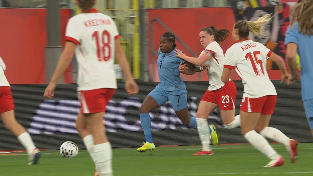 Beerensteyn loopt uit de rug weg van haar tegenstander en dendert langs de achterlijn naar het doel. Haar teruggetrokken bal belandt via een verdediger nog bijna in de Poolse goal. Het eerste gevaar van Nederland.