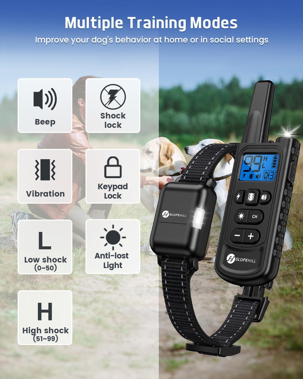 <br> Package Dimensions : 6.97 x 4.45 x 2.05 inches; 10.23 ounces <br> Item model number : 880 <br> Batteries : 2 Lithium Polymer batteries required. <br> Date First Available : October 4, 2022 <br> Manufacturer : SLOPEHILL <br> ASIN : B0BH8LZM3X <br> Best Sellers Rank: #59,431 in Pet Supplies (See Top 100 in Pet Supplies) #335 in Electronic Training Collars <br> Customer Reviews: 4.2 4.2 out of 5 stars 422 ratings var dpAcrHasRegisteredArcLinkClickAction; P.when('A', 'ready').execute(function(A) { if (dpAcrHasRegisteredArcLinkClickAction !== true) { dpAcrHasRegisteredArcLinkClickAction = true; A.declarative( 'acrLink-click-metrics', 'click', { "allowLinkDefault": true }, function (event) { if (window.ue) { ue.count("acrLinkClickCount", (ue.count("acrLinkClickCount") || 0) + 1); } } ); } }); P.when('A', 'cf').execute(function(A) { A.declarative('acrStarsLink-click-metrics', 'click', { "allowLinkDefault" : true }, function(event){ if(window.ue) { ue.count("acrStarsLinkWithPopoverClickCount", (ue.count("acrStarsLinkWithPopoverClickCount") || 0) + 1); } }); }); <br>7 training modes: This water-resistant dog shock collar with Beep, Vibration, Low shock level, High shock level, Shock lock, Light and No Shock modes, you can use it to teach a dog basic commands and solve an uncontrollable dog's behaviour problem<br>Shock locked mode is convenient for you to use only vibration and beep mode. Low shock(0-50), high shock(51-99), kepad lock modes help you adjust the accurate and comfortable static level for your dog and prevents any misoperation on the remote.<br>Extra-long life and rechargeable battery: rechargeable remote and receiver, a general USB charging cable included in the package can charge them at the same time. After 2 hours of fully charging, the collar is able to work 15-20 days<br>IP68 water-resistant and adjustable electronic trainer collar: The training collar receiver is water-resistant which offers your pets maximum flexibility during outdoor activities. Size adjustable collar strap, length from 8 to 26 inches, fits dogs from 8 to 140 lbs<br>If the dog's hair is too long or thick, it is necessary to slightly shave off the hair on the neck collar contact point to help with product use.