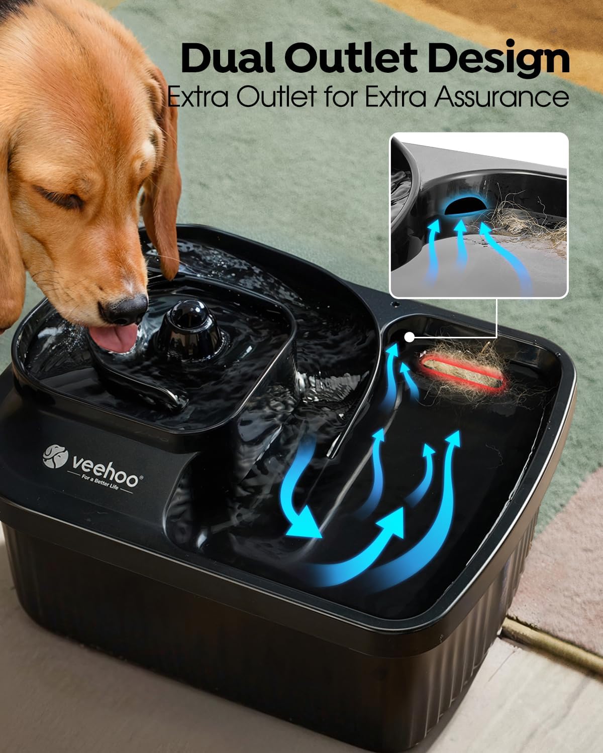 <br> Product Dimensions : 13.7 x 11 x 7.48 inches; 5.38 Pounds <br> Item model number : CWWSQ2408CP30 <br> Date First Available : March 8, 2024 <br> Manufacturer : Veehoo <br> ASIN : B0CR5RNZY5 <br> Best Sellers Rank: #81,846 in Pet Supplies (See Top 100 in Pet Supplies) #308 in Dog Fountains <br> Customer Reviews: 4.2 4.2 out of 5 stars 189 ratings var dpAcrHasRegisteredArcLinkClickAction; P.when('A', 'ready').execute(function(A) { if (dpAcrHasRegisteredArcLinkClickAction !== true) { dpAcrHasRegisteredArcLinkClickAction = true; A.declarative( 'acrLink-click-metrics', 'click', { "allowLinkDefault": true }, function (event) { if (window.ue) { ue.count("acrLinkClickCount", (ue.count("acrLinkClickCount") || 0) + 1); } } ); } }); P.when('A', 'cf').execute(function(A) { A.declarative('acrStarsLink-click-metrics', 'click', { "allowLinkDefault" : true }, function(event){ if(window.ue) { ue.count("acrStarsLinkWithPopoverClickCount", (ue.count("acrStarsLinkWithPopoverClickCount") || 0) + 1); } }); }); <br>2.4Gal Large Capacity & Wide Drinking Area for Multi-pet: With a generous 2.4 gallon capacity, this dog water fountain is ideal for large dogs or multi-pet families. The spacious drinking area allows pets to drink comfortably from any direction. Say goodbye to constant refills and hello to more quality time with your pets.<br>Whisper-Quiet Operation & Smart LED Reminder: Our dog water fountain for large dogs operates at near-silent level (<35 dB), ensuring that your home remains a tranquil haven. Plus, the LED indicator switches from blue to red to alert you when it's time to refill, ensuring your pets always have access to the fresh water they need to stay healthy and hydrated.<br>Mess Free With The Diatomaceous Earth Mat: Our pet fountain comes with an ultra-absorbent diatomaceous earth mat that captures drips and spills, keeping your floors dry and clean. It's quick-drying and easy to maintain, making it a must-have for a clean and tidy pet drinking area.<br>Dual-Outlet Design for Uninterrupted Flow: Our water fountain for dogs is equipped with an extra outlet to prevent blockages, ensuring a continuous flow of water, even when the main path is blocked by pet hair. Your pets will enjoy an uninterrupted supply of fresh water, giving you peace of mind.<br>Easy to Clean & Bonus 5 Replacement Filters: Crafted from premium, food-grade ABS material, our dog fountain is BPA-free, ensuring the utmost safety for your pet. Cleaning is a breeze thanks to its detachable design, and we've included 5 additional filters to maintain the water's purity over time.