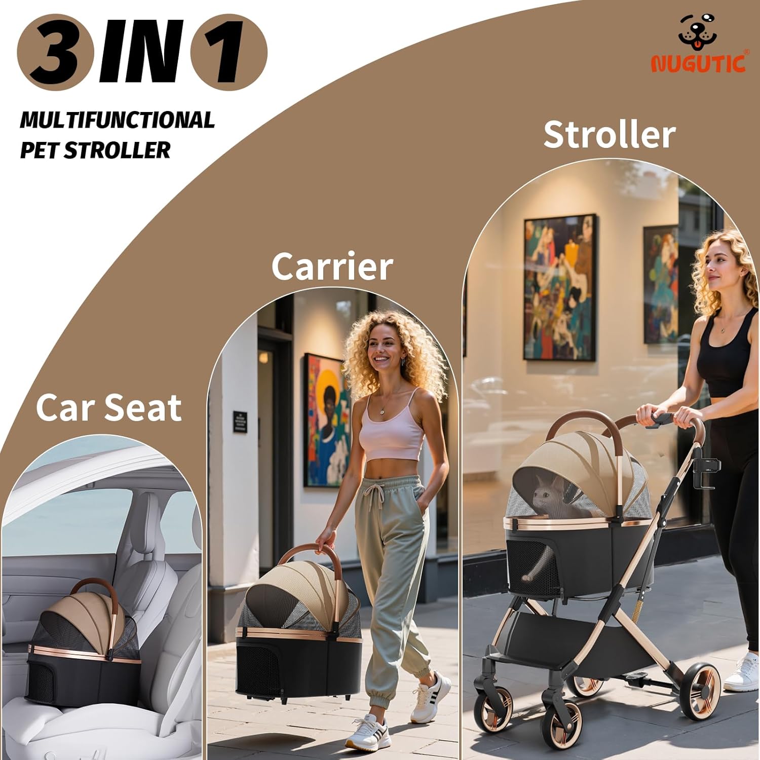 <br>Oxford Fabric<br>REIMAGINED PORTABILITY - Th conveisniently detachable carrier not only fits perfectly on a car seat but also transforms effortlessly into an elegant, standalone pet stroller for small pets. Thanks to its one-click folding mechanism and lightweight design, storing and transporting it has become incredibly easy.<br>SAFETY COMES FIRST – The front wheels rotate 360° for effortless handling, and four shock absorbers provide a smooth ride on any terrain. The rear wheels feature a convenient one-touch brake for added control, while internal tethers ensure your puppy stays safely in place.<br>DURABLE AND COMFORTABLE – Made with Oxford cloth, a lightweight aluminum frame, PU solid tires, and 4 shock stabilizers, this stroller is designed for long-lasting use and pet comfort. It fits pets up to 50 lbs. The interior has soft padding, mesh windows for ventilation, and a weather cover for all conditions.<br>FLEXIBLE STORAGE SOLUTIONS – With the spacious storage basket, convenient cup holder, and practical mesh pockets, you’ll have everything you need within easy reach. These thoughtful features are ideal for keeping pet treats, water, and your personal items organized, making every outing with your puppy a delightful experience.<br>EXCELLENT CHOICE - No tools required! You can assemble it in just a few minutes after receiving the box, letting you spend more time creating memories with your pet. Treat your puppy to this stylish new stroller today – it's the perfect gift for any pet lover!