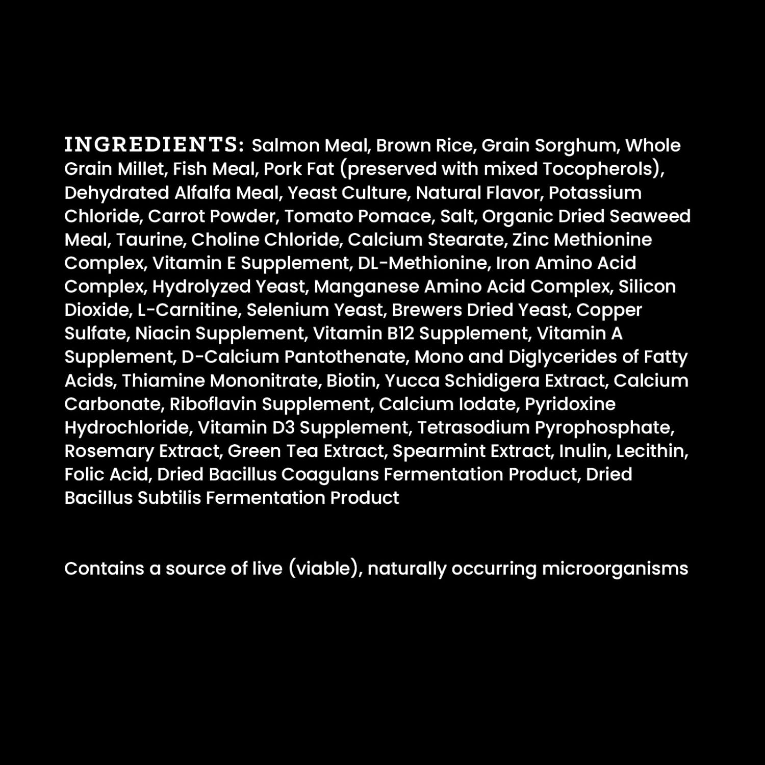 QUALITY INGREDIENTS: High-quality salmon meal is the first ingredient in this nutrient dense recipe. With high amounts of animal protein, we proudly share the percentage of all protein sources on the front of our bag. The high-quality proteins in this recipe help build and maintain lean muscle, sustain energy and promote stamina for a full and healthy life.