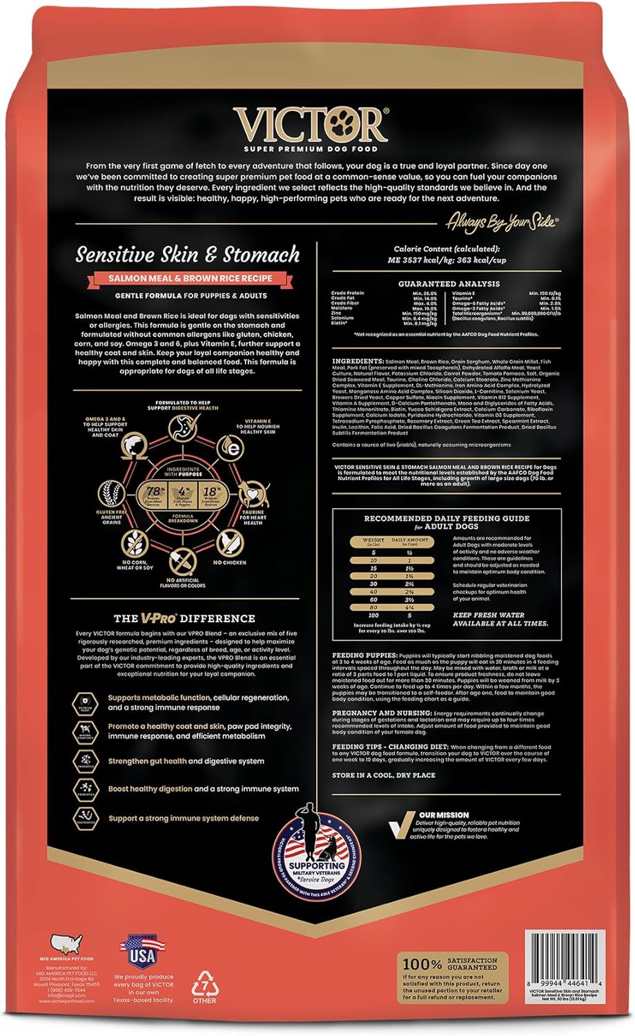 VICTOR’s Sensitive Skin and Stomach Salmon Meal & Brown Rice Recipe is ideal for dogs with sensitivities or allergies. This digestible formula is gentle on the stomach and formulated without common allergens like gluten, chicken, corn, or soy. With omega 3 and 6, plus Vitamin E, this recipe supports a healthy coat and skin.  Like all VICTOR products, the majority of the protein in this recipe comes from high-quality meat sources. Specifically, 78% of the protein comes from salmon and fish meals. The protein to fat ratio for this formula is: 26% protein and 14% fat. Our sensitive stomach dog food recipe is appropriate for dogs of all life stages – puppy through adulthood. VICTOR Sensitive Skin and Stomach Salmon Meal & Brown Rice Recipe for Dogs is formulated to meet the nutritional levels established by the AAFCO Dog Food Nutrient Profiles for All Life Stages, including growth of large size dogs (70 lb. or more as an adult). Formula claims include: > Promotes healthy skin & coat, perfect sensitive skin dog food > Supports gut health, ideal dog food for sensitive stomachs > Boosts healthy digestion > Only gluten free ancient grains > Taurine for heart health > No corn, wheat or soy > No artificial flavors or colors > No chicken > No peas or pea protein We proudly produce every bag of VICTOR kibble in our own Texas-based facility and do not waver in our commitment to high-quality nutrition. A majority of ingredients of our pet food come from ranches, farms and other trusted suppliers who are within a day’s drive of our East Texas plant. VICTOR is proud to support miltary Veterans and service dogs.