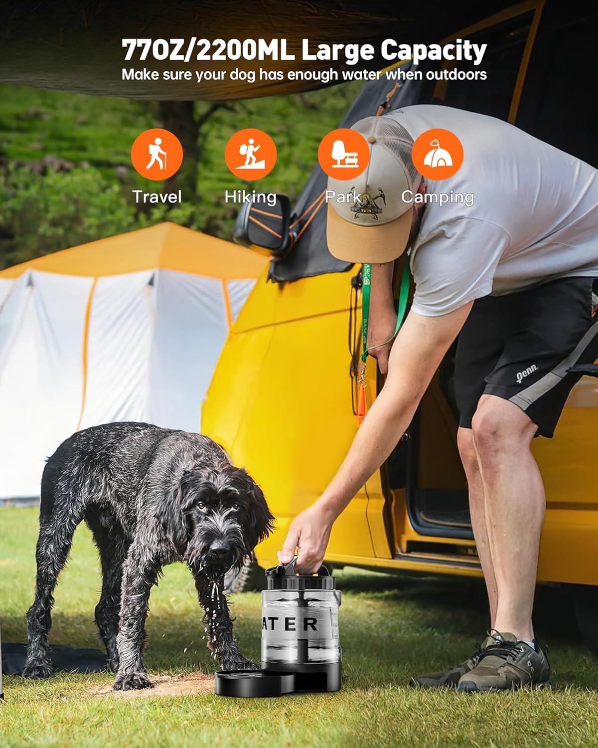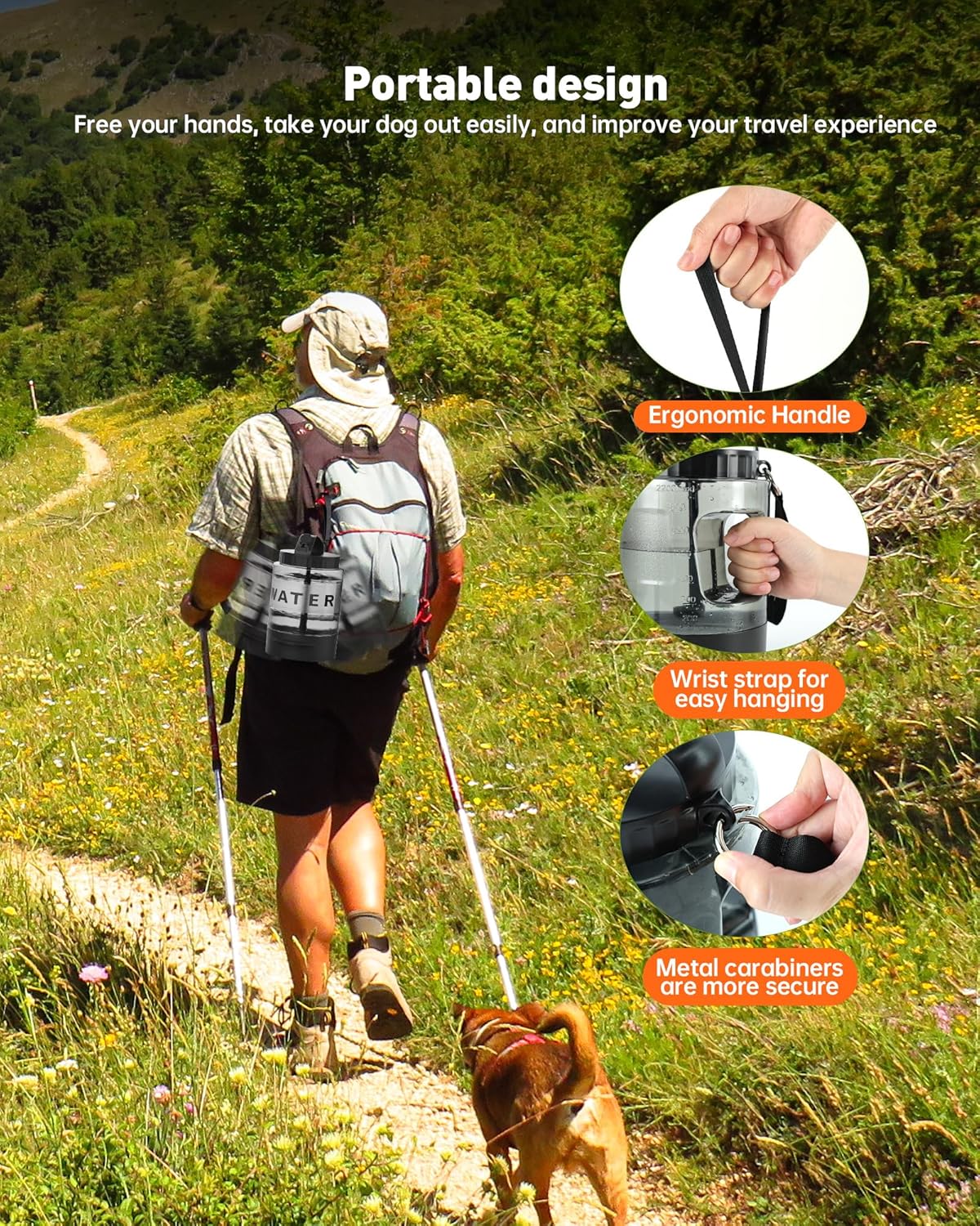 <br> Package Dimensions : 11.02 x 6.61 x 6.1 inches; 1.32 Pounds <br> Item model number : Dog Water Bottle-2.2L <br> Date First Available : May 27, 2025 <br> Manufacturer : PETNF <br> ASIN : B0F4JPX8NW <br> Best Sellers Rank: #79,704 in Pet Supplies (See Top 100 in Pet Supplies) #107 in Dog Water Bottles <br> Customer Reviews: 4.5 4.5 out of 5 stars 60 ratings var dpAcrHasRegisteredArcLinkClickAction; P.when('A', 'ready').execute(function(A) { if (dpAcrHasRegisteredArcLinkClickAction !== true) { dpAcrHasRegisteredArcLinkClickAction = true; A.declarative( 'acrLink-click-metrics', 'click', { "allowLinkDefault": true }, function (event) { if (window.ue) { ue.count("acrLinkClickCount", (ue.count("acrLinkClickCount") || 0) + 1); } } ); } }); P.when('A', 'cf').execute(function(A) { A.declarative('acrStarsLink-click-metrics', 'click', { "allowLinkDefault" : true }, function(event){ if(window.ue) { ue.count("acrStarsLinkWithPopoverClickCount", (ue.count("acrStarsLinkWithPopoverClickCount") || 0) + 1); } }); }); <br>77 oz Large Capacity Design: This portable dog water bottle has a large water storage capacity of 77 oz, one-time hydration lasts longer. For medium to large dogs and families with multiple dogs, there is no need to add water frequently. There is no need to worry about the dog being thirsty or having no water during long outdoor activities, which increases the owner's sense of security when traveling<br>Leak-proof technology: This dog water bottle portable has undergone thousands of leak-proof tests, the sealing silicone gasket on the inside of the lid still fits perfectly without falling off, it has one-touch water control, eliminates leakage, self-driving tours, hiking, backpacking, etc., luggage is dry and no longer soaked by water, say goodbye to the trouble of wet bags, keep items clean, and make outdoor travel more comfortable<br>Safe and durable material: This dog travel water bottle is made of food-grade materials + a solid structure, resistant to falling and pressure, and is not easy to break after long-term use for active pets; it is easier for owners to clean, buy once, and use for many years, protecting the health of pets<br>Suitable for outdoor scenes: This portable water bowl for dogs adopts a dust-proof and scratch-resistant design and adapts to various terrains such as outdoor, travel, camping, walking, beach, hunting, etc., and pet owners who like various outdoor adventures can replenish water anytime and anywhere. Fill a bottle and it is suitable for all scenarios, without having to purchase equipment for different environments<br>Portable design: This travel water bowl for dogs adopts an ergonomic handle + wrist strap + metal carabiner, which can be carried with one hand. Dog owners who walk their dogs can easily hang it on a backpack or leash, freeing their hands and taking their dogs out easily, which improves the travel experience<br>Two-in-one structure: This portable dog water bottle with bowl integrates a water dispenser and a bottom pull-out water bowl into one, no additional container is required, and pet owners who want to simplify their equipment can operate more quickly and save space, use multiple things in one, and store more simply when traveling, reducing the burden of luggage immediately<br>Ease of operation: This dog water bowl dispenser portable adopts a one-hand flip cover + button water dispensing, which can quickly supply water. For owners who need to hold the leash, hold the baby, or take photos with one hand, it can replenish water more efficiently and drink immediately after opening, without delaying the rhythm of the trip, making pet raising easier<br>Capacity visualization: This outdoor dog water dispenser uses a transparent scale window to view the remaining water volume in real-time. Owners who pay attention to their pets' water intake can accurately grasp the rhythm of water replenishment at a glance, without worrying about running out of water or wasting it, giving the dog the most intimate care<br>Enhanced durability: This water bottle for dogs on the go adopts a thickened bottle body + anti-fall design, which is durable and can be used in high-intensity scenarios such as outdoors, camping, walking, beach, hunting, etc., reducing the risk of damage, and can be used for a long time without frequent replacement<br>Ice Cube Compatibility: This dog portable water bottle adopts a wide-mouth design, which allows you to directly put in ice cubes to cool down. During the hot summer months, owners who need to provide their pets with cold drinking water can instantly cool down and give their dogs a cool experience. It is a must-have in summer