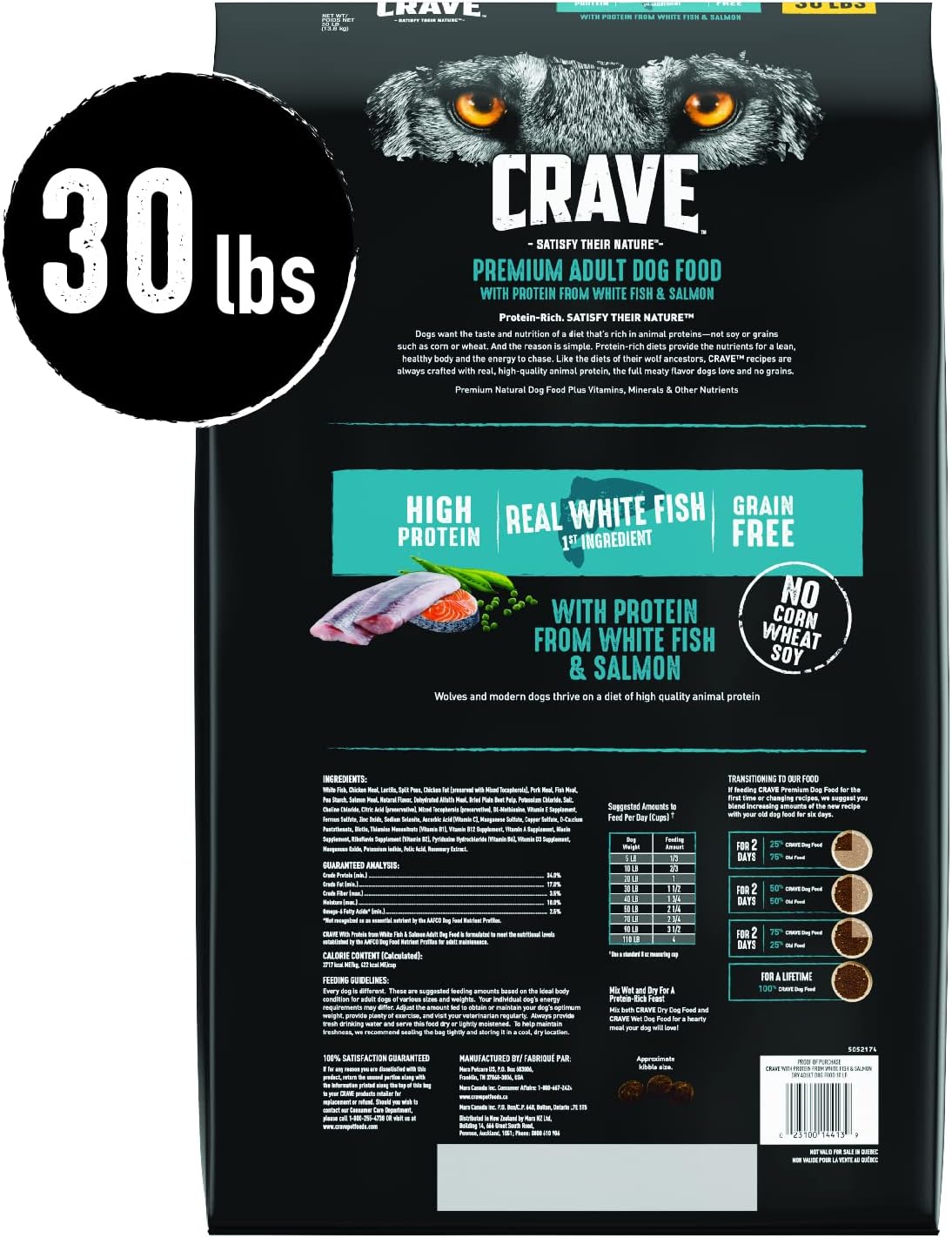 Contains one (1) 30 lb. bag of CRAVE Grain Free Adult Dry Dog Food with Protein from White Fish and Salmon—for any size dog