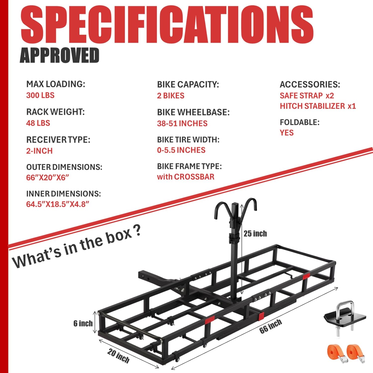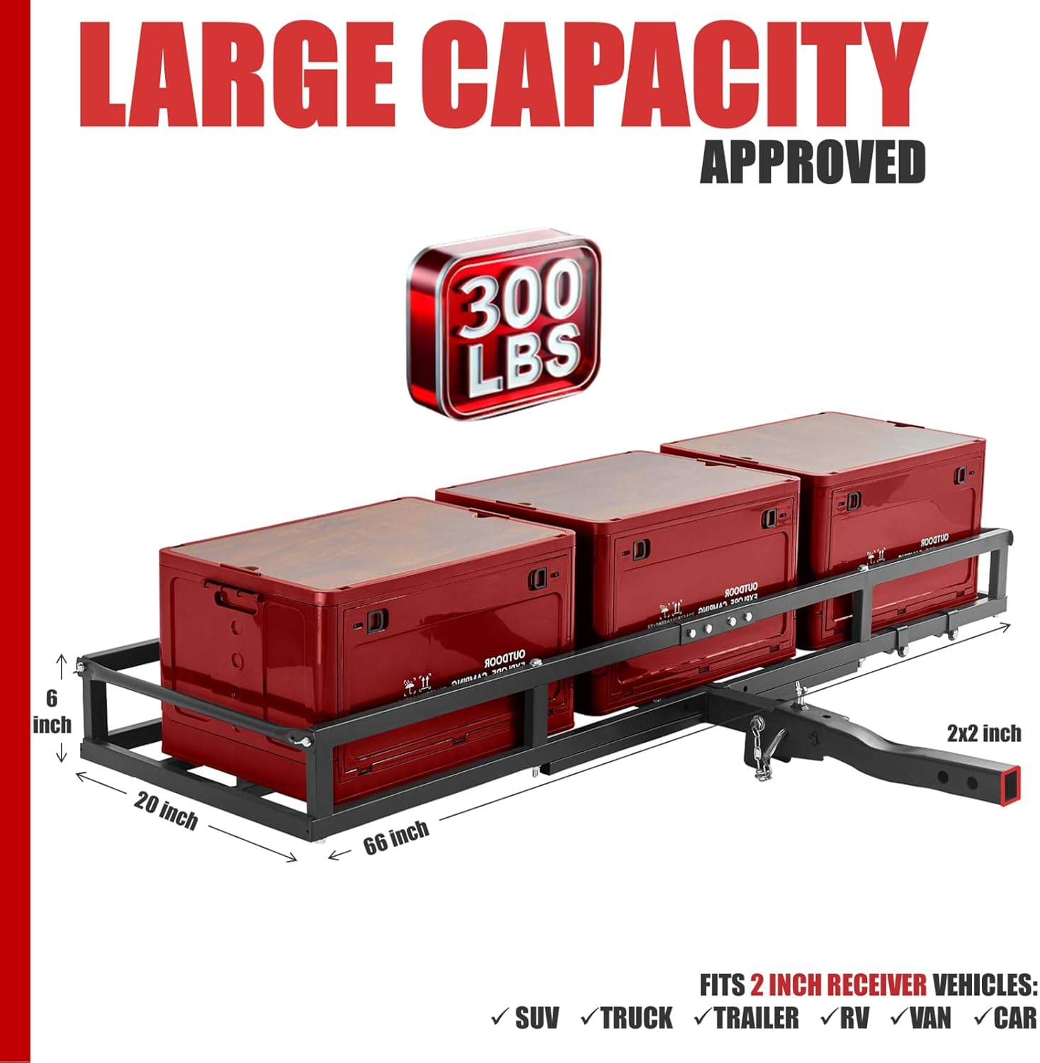 LARGE HITCH CARGO CARRIER: Ideal for travel trailers and outdoor adventures, as a hitch rack, it boosts your vehicle’s storage capacity during travel. As a hitch cargo rack, it measures 66x20x6 inches, offering ample space and strong load-bearing capability to haul camping gear, travling items and more