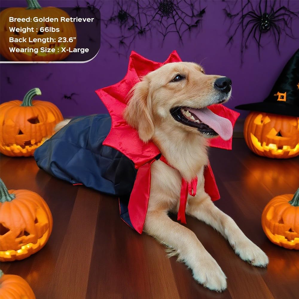<br> Package Dimensions : 8.54 x 7.48 x 0.94 inches; 3.21 ounces <br> Item model number : Vampire <br> Date First Available : September 10, 2024 <br> Manufacturer : Wiz BBQT <br> ASIN : B0FDX18H71 <br> Best Sellers Rank: #20,796 in Pet Supplies (See Top 100 in Pet Supplies) #230 in Dog Costumes <br> Customer Reviews: 4.7 4.7 out of 5 stars 139 ratings var dpAcrHasRegisteredArcLinkClickAction; P.when('A', 'ready').execute(function(A) { if (dpAcrHasRegisteredArcLinkClickAction !== true) { dpAcrHasRegisteredArcLinkClickAction = true; A.declarative( 'acrLink-click-metrics', 'click', { "allowLinkDefault": true }, function (event) { if (window.ue) { ue.count("acrLinkClickCount", (ue.count("acrLinkClickCount") || 0) + 1); } } ); } }); P.when('A', 'cf').execute(function(A) { A.declarative('acrStarsLink-click-metrics', 'click', { "allowLinkDefault" : true }, function(event){ if(window.ue) { ue.count("acrStarsLinkWithPopoverClickCount", (ue.count("acrStarsLinkWithPopoverClickCount") || 0) + 1); } }); }); <br>【For Large and Extra-large Breeds】This Golden Retriever Halloween Costume is specifically designed for large and extra-large dog breeds, such as Golden Retrievers, German Shepherd,Great Danes.<br>【Polyester Fabric】Our Large Dog Halloween Costumes are made of polyester, soft and breathable. This ensures that your dog will not feel uncomfortable or overheated while wearing this Dog Vampire Costume.<br>【Red Standing Collar】The Big Dog Halloween Costume XL features a red standing collar. It will not collapse, effectively framing your dog's face and adding a cute and distinctive touch.<br>【Adjustable Cord Design】The Great Dane Halloween Costume comes with a well - designed cord,not only practical for easily fastening the cape around the dog's neck, but also ensuring that the cape stays in place while moving around.<br>【Creates a Halloween Atmosphere】With its vampire style, Our Large dog costumes Halloween is ideal for creating a spooky and fun Halloween atmosphere. It makes your dog look like a part of the Halloween celebration.